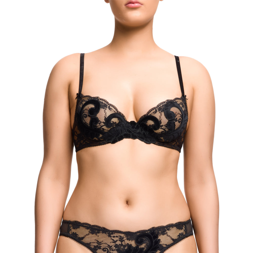 Perfectly named by Dita. Velveteese is evocative lace lingerie with rich velvet detailing. Dita designed a rich, swirling velvet applique on a fine lace ground. The Velveteese bra is a sheer underwired bra featuring the velvet detailing in the cups and stretch fishnet back. The bra has velvet shoulder straps. Velveteese is refined luxurious lingerie.