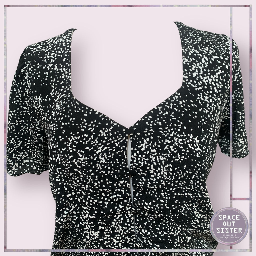 Enhance your wardrobe with the Monochrome Bodysuit. This stylish piece features a black and white design, short sleeves, and a loosely draped top. Perfect for any occasion, this bodysuit adds a touch of elegance and versatility to your outfit.