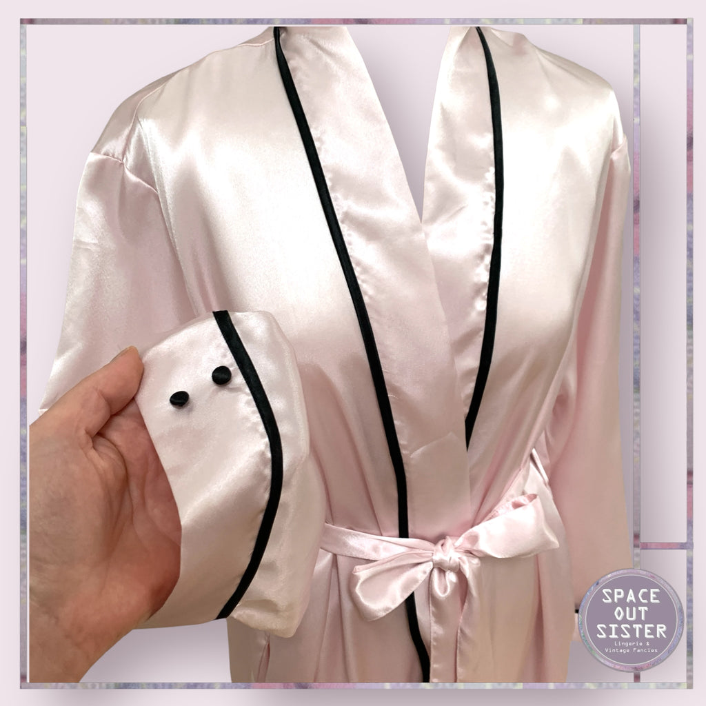 Introducing the Very AP C&A Robe - the perfect combination of luxury and style. Made with smooth satin and accented with defined black piping, this knee length robe exudes elegance. The lovely button detail on the cuffs adds a touch of sophistication.