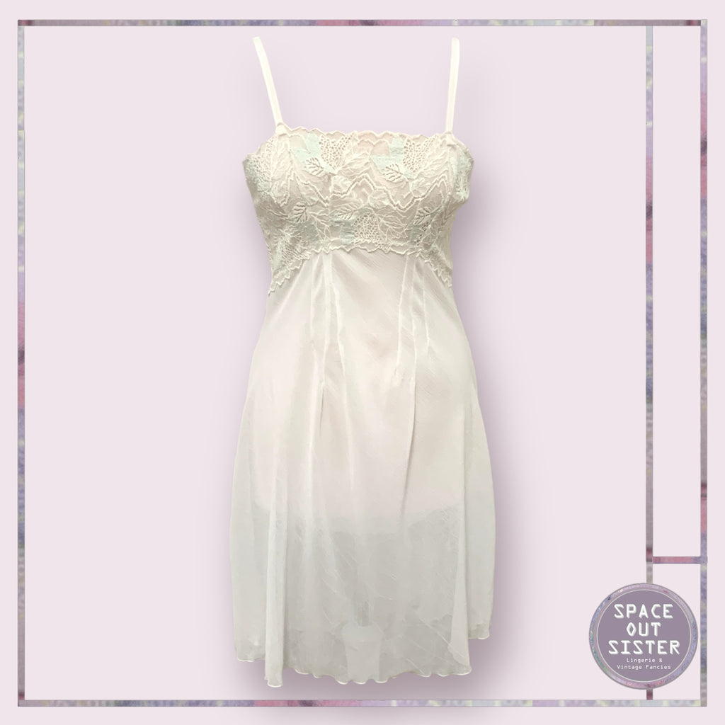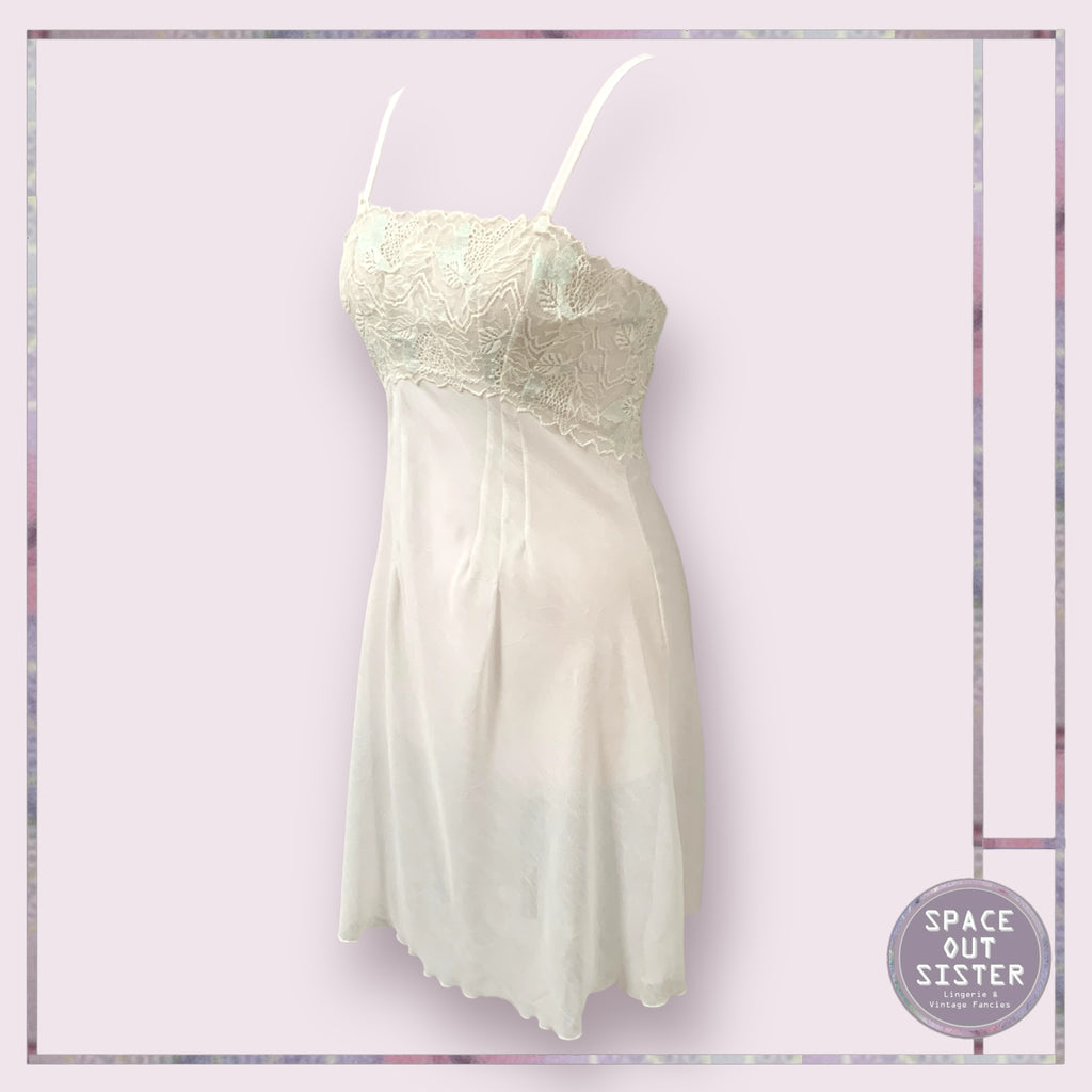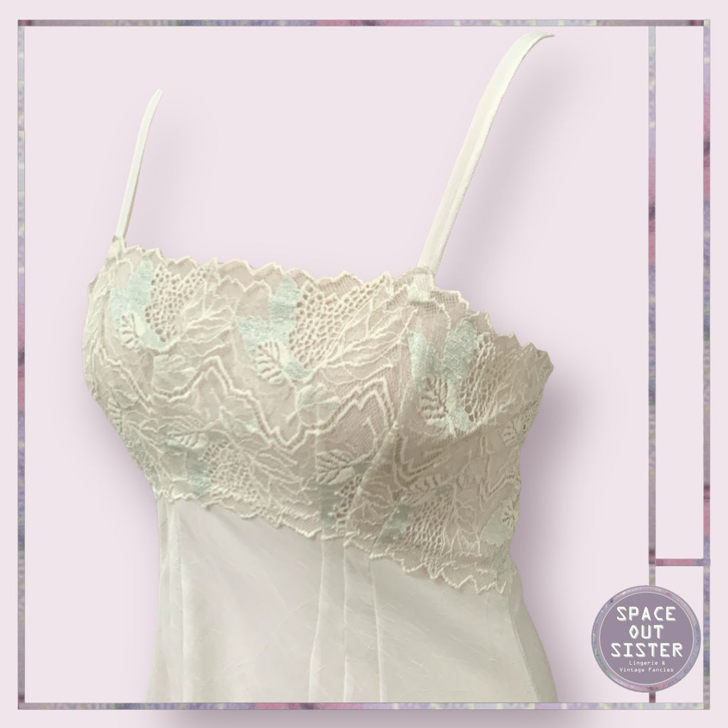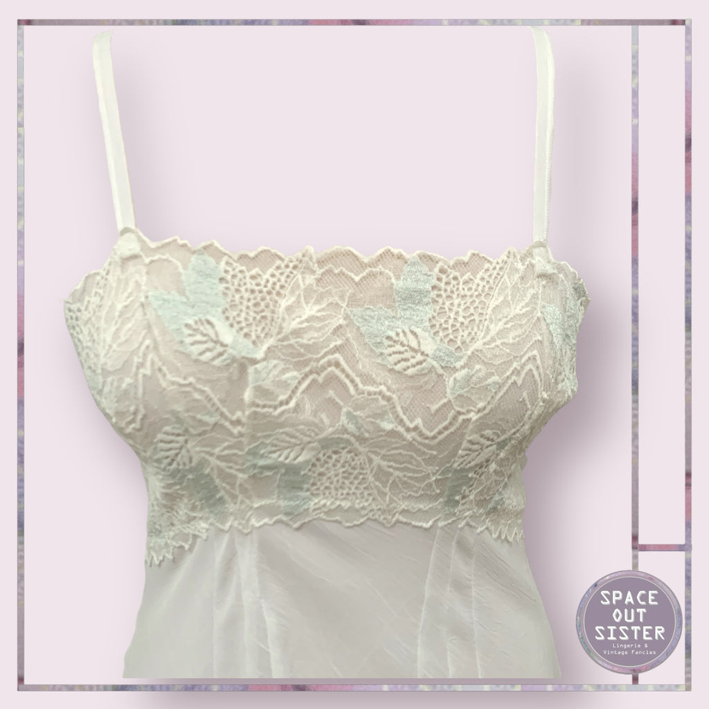 Slip into nostalgia with the Vintage Charnos Slip Dress! This beauty features a soft lace bust that whispers sweet nothings. Adorned with light green detailing, it’s like wearing a delicate piece of art.