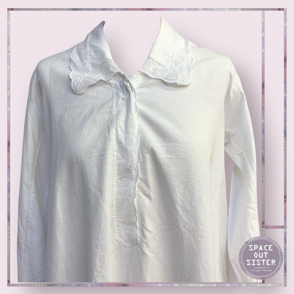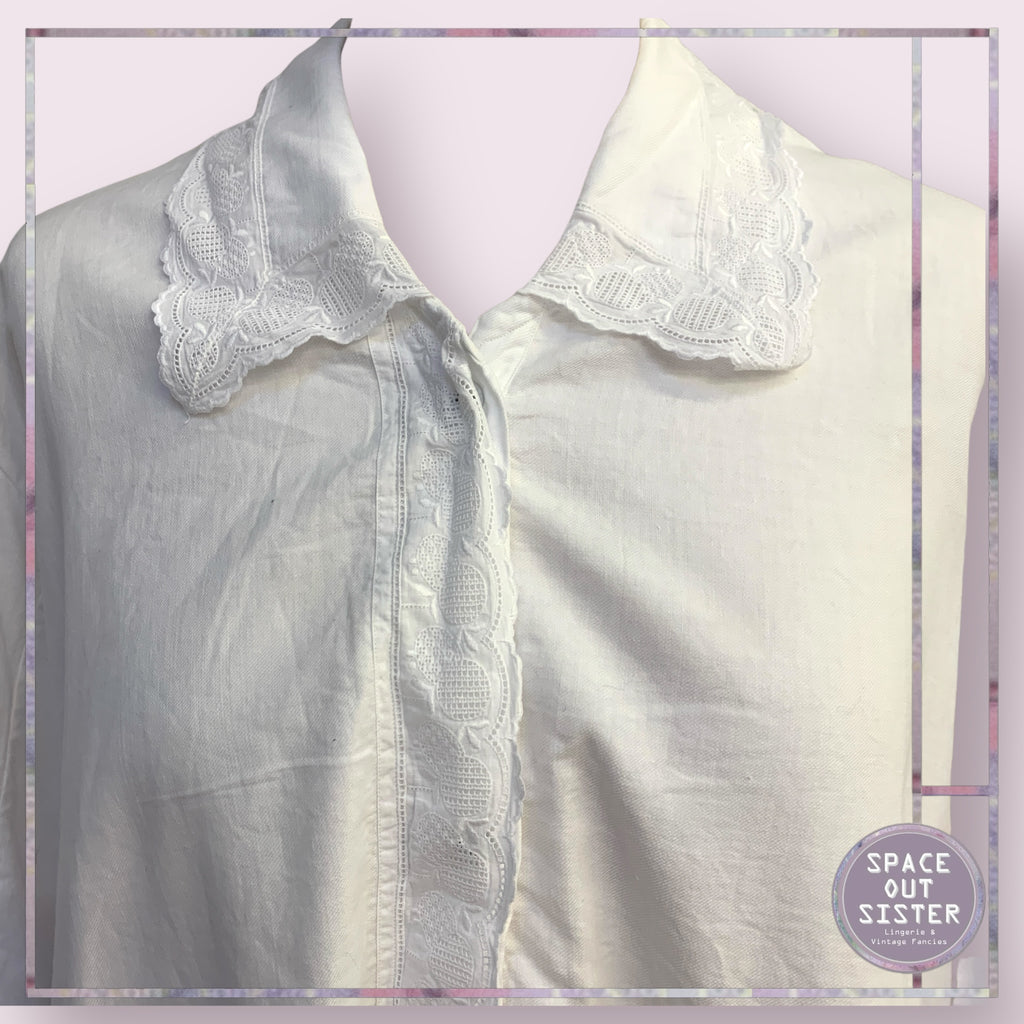 This vintage cotton lace nightshirt is a beautiful addition to your sleepwear collection. The delicate cotton lace detailing on the collar adds a charming touch while the button neckline provides convenience. Sleep comfortably and stylishly with this classic nightdress.