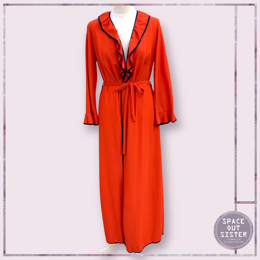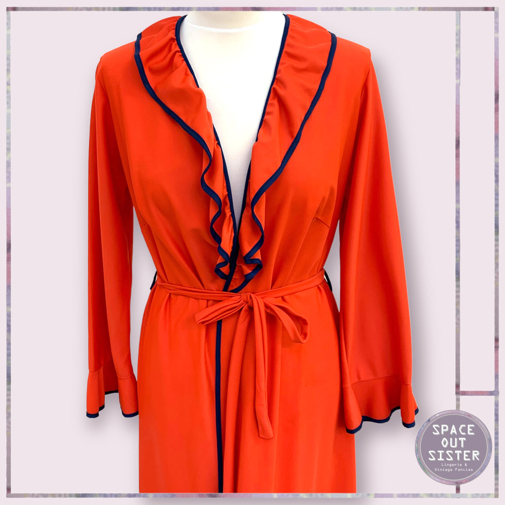 Always ruffles! This full length red robe has navy outlining the ruffles on the sleeves and lapels. A beautiful bright red, with interior pockets and matching belt. Excellently presented.