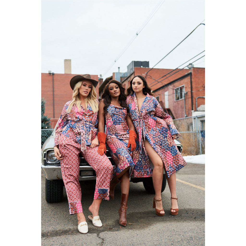 Ohhh! The Quilted Robe! This style is made with super soft satin charmeuse that’s digitally printed, with padding inside and super soft bamboo jersey lining the inside. So warm and cozy, but fabulous at the same time! Wear as a robe at home or even a coat/coverup. Versatility is key!