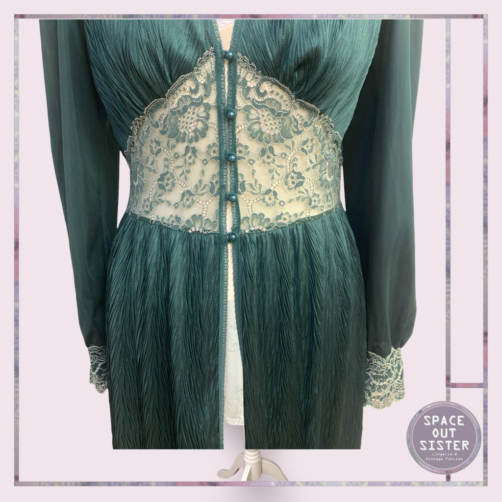 Indulge in luxury and elegance with the Vintage Charnos Robe. Crafted in a beautiful forest green color, this robe features delicate lace inserts and button fastenings for a stunning bodice. A timeless statement piece for any wardrobe.