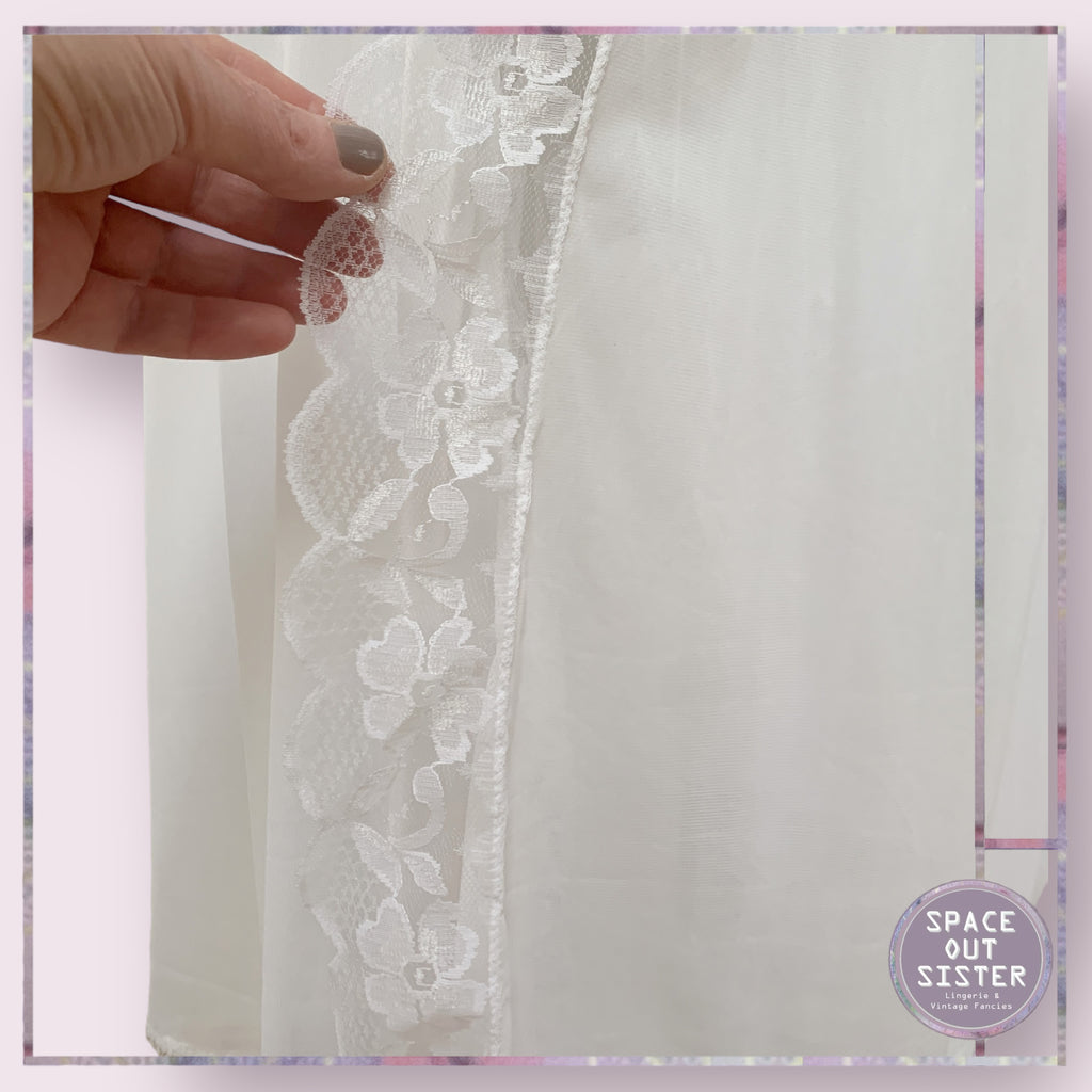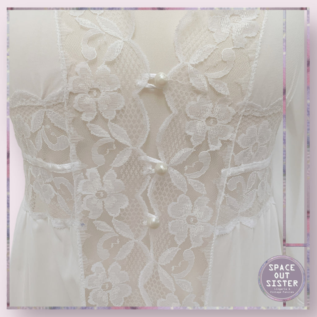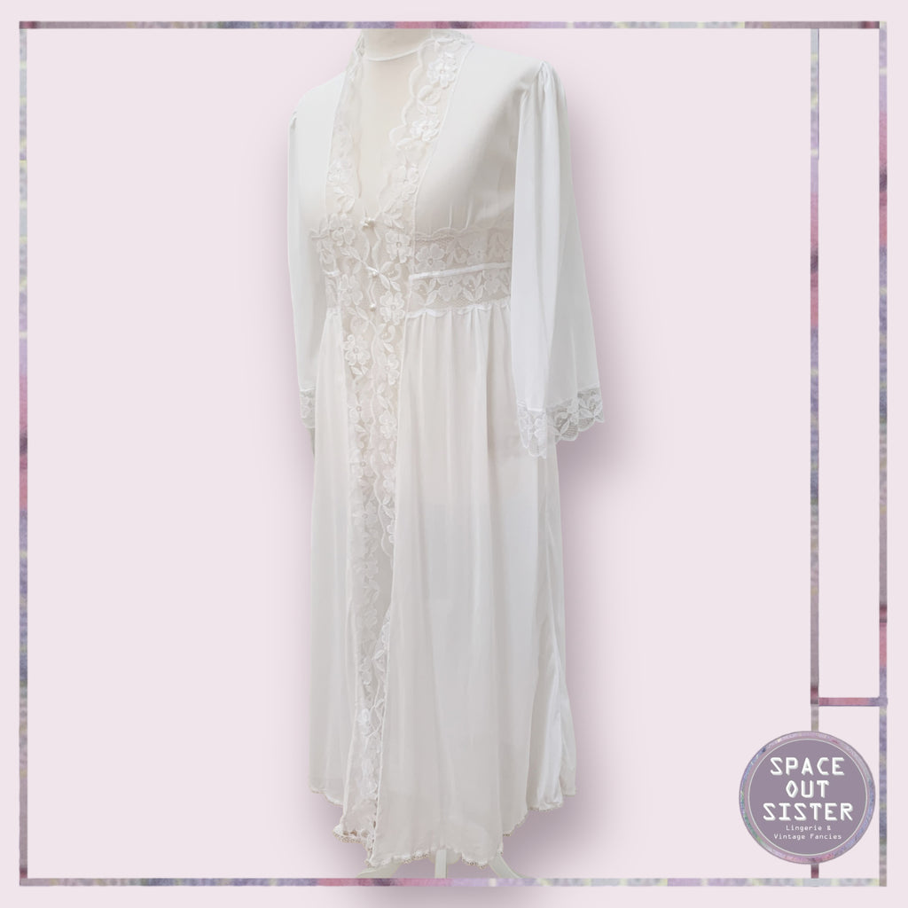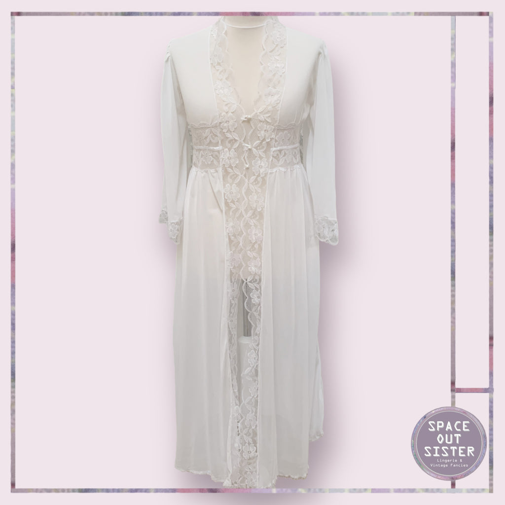 This vintage Marpem robe is a timeless piece with gorgeous details that will never go out of style. It is crafted with white lace trim and features a faux Pearl button closure. The full length robe and full length sleeves add to the romantic look that will keep you looking chic.