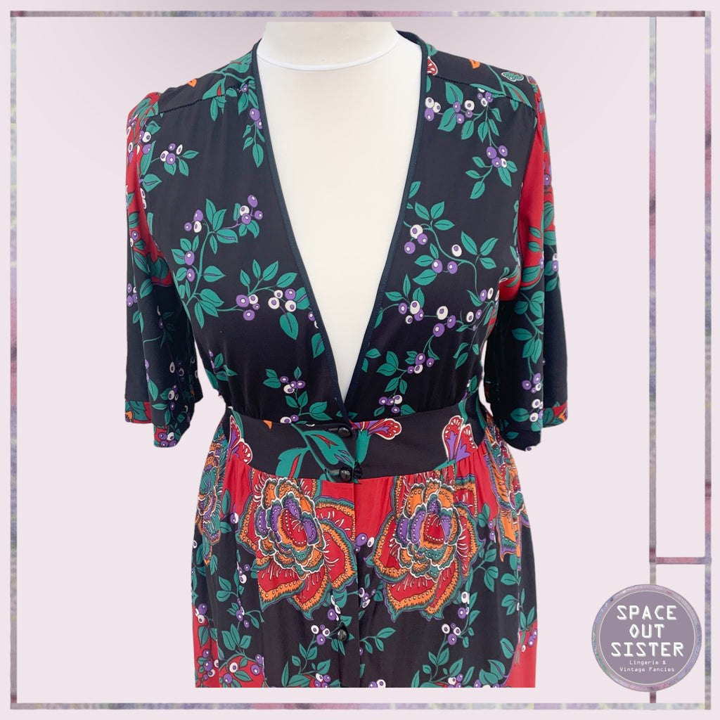 Indulge yourself in the timeless elegance of the Vintage Simone Robe. Crafted from lightweight fabric and featuring a beautiful black and brightly colored botanical print, this robe is the perfect choice for any occasion. It is designed with a button closure and half sleeves, and falls to full length. Although one button is missing, and a stitch needs to be done on the button hole, this robe is still a standout piece.
