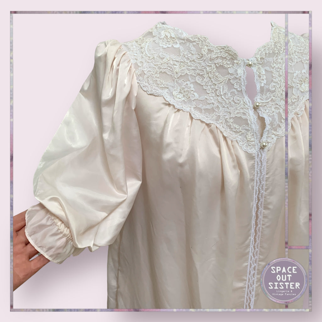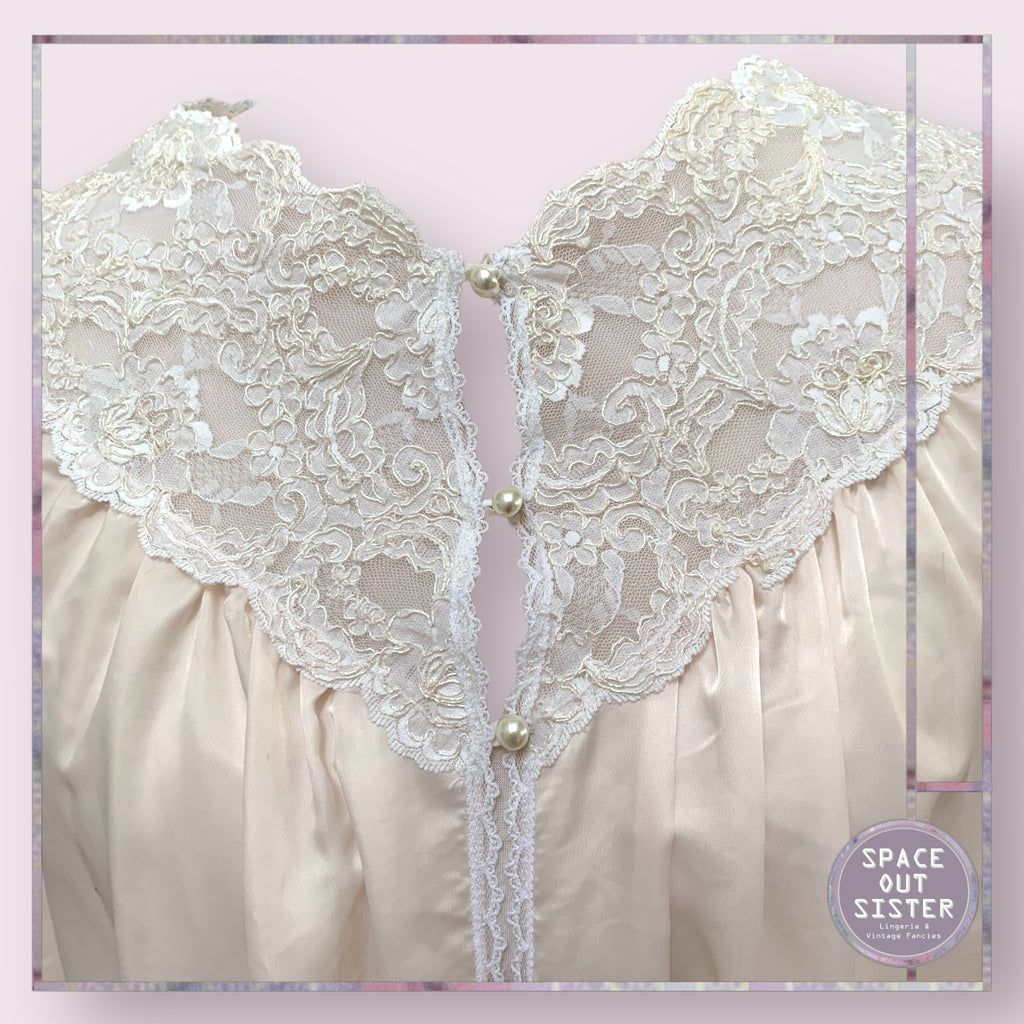 Indulge in elegance with our Vintage Barbizon Robe. This stunning piece boasts a soft, petal blush pink color and a delicate lace necklace, adorned with pearl buttons. Its full length design adds a touch of grace to your evenings. As seen. Some small blemishes on the skirt.