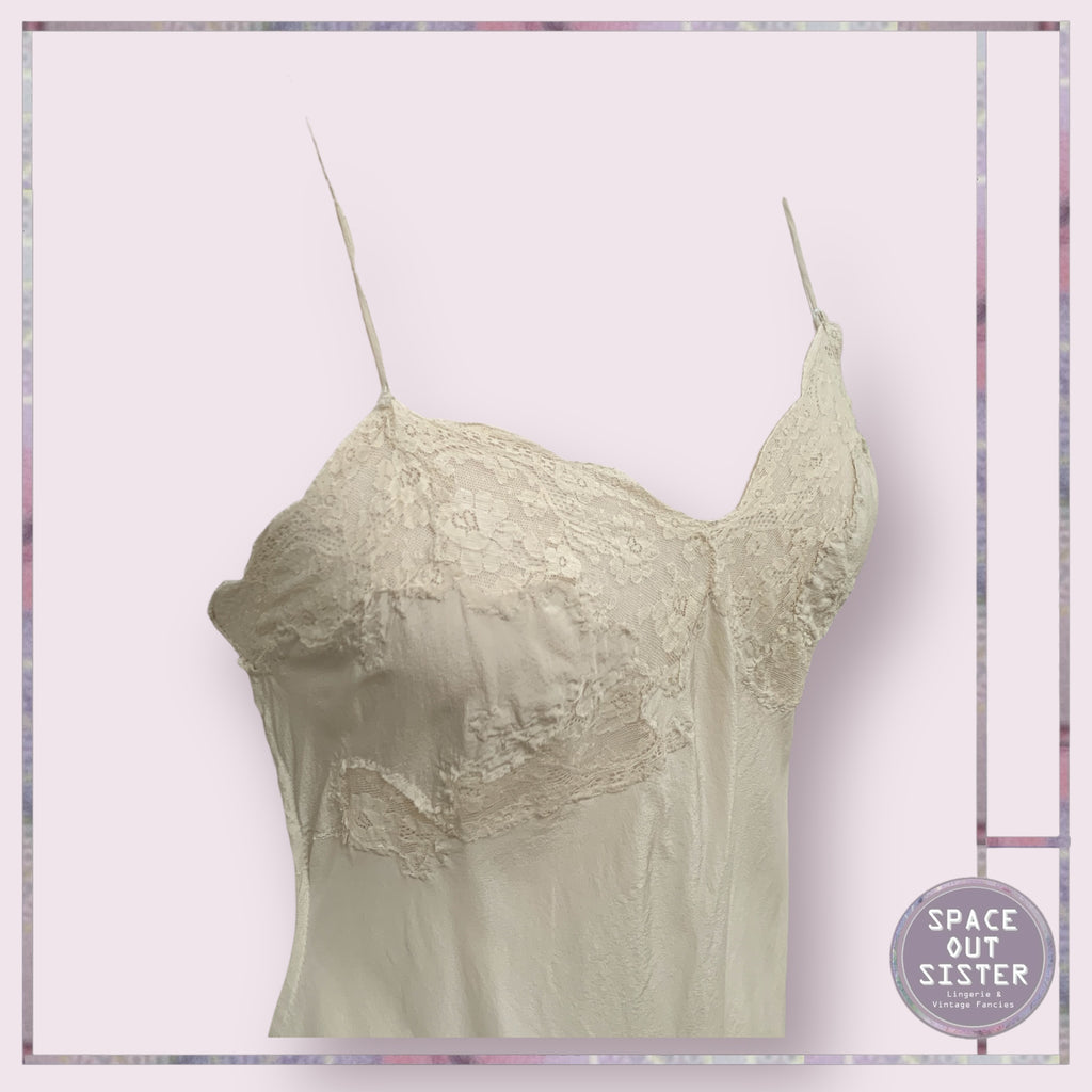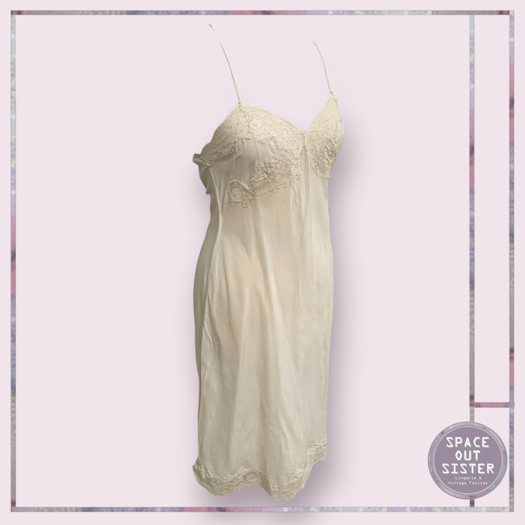 This Vintage Silk Oyster Slip is a delicate and ornate piece made of 100% pure silk. The oyster color adds a touch of elegance to this knee-length slip. Enjoy the luxurious feel and quality craftsmanship of this vintage slip.