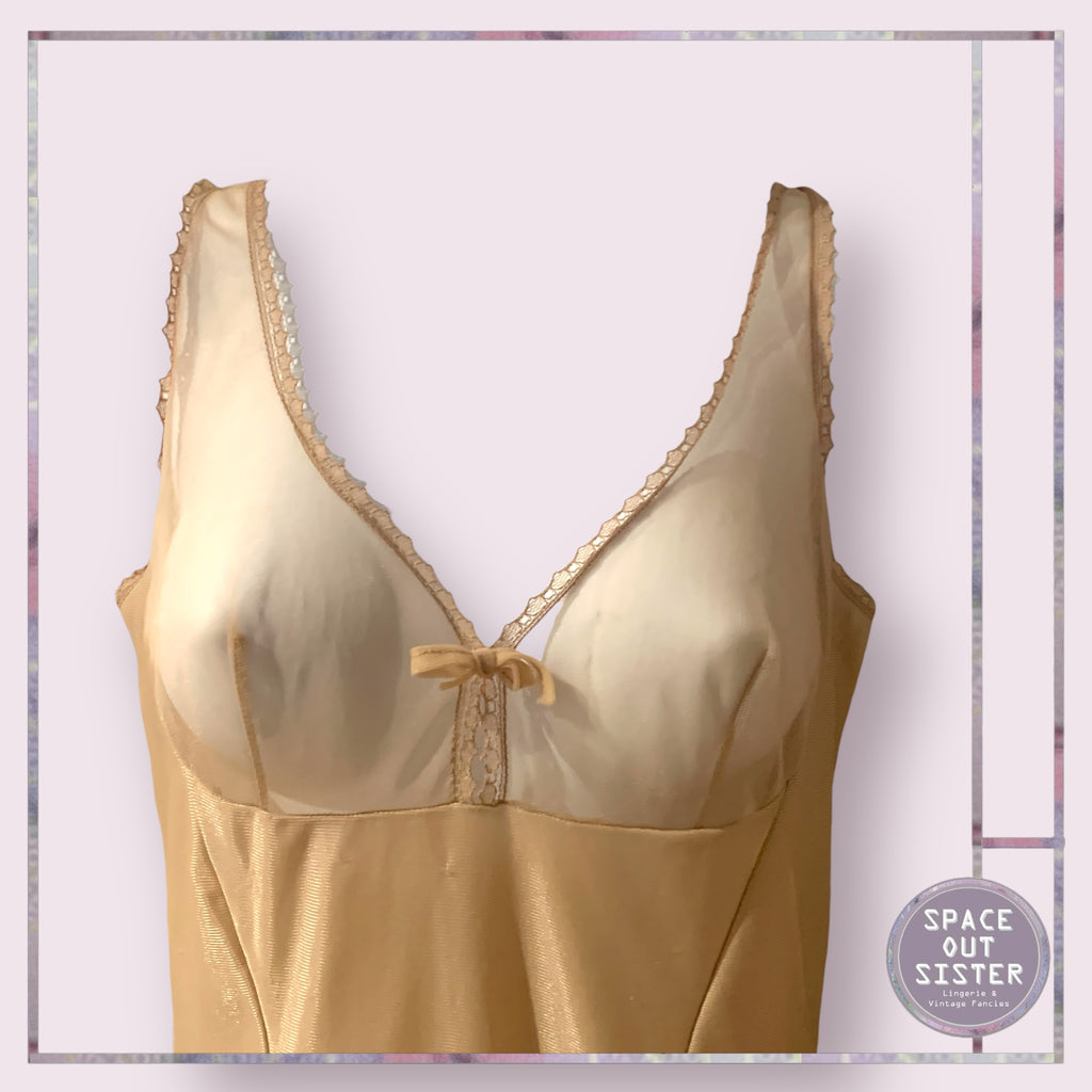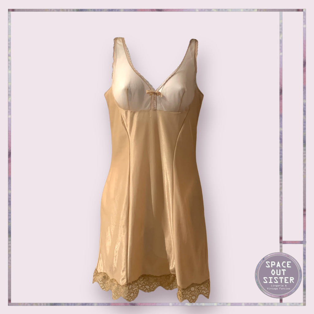Introducing the Vintage Gunther Slip. This unique slip features a sheer toffee-coloured bust and a center bow, adding a touch of elegance. With its knee-length design, it's perfect for any occasion. Add a touch of vintage charm to your wardrobe today.