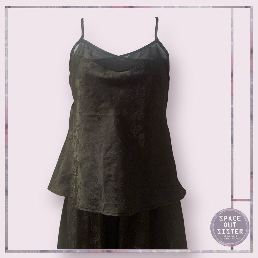This Vintage Nuit PJ set features a luxurious black satin with an embossed fabric, providing comfort and style. The wide elasticated waist offers a secure fit while the camisole top adds a touch of elegance. Elevate your bedtime routine with this timeless set.