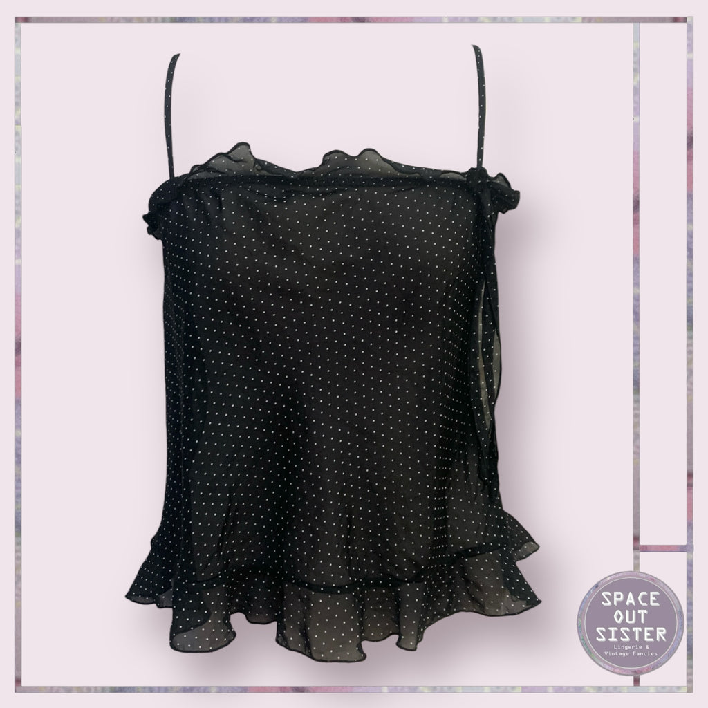 Get ready to polka-dance your way into comfort! This Vintage Polka Camisole features a loose fit that's breezier than a summer picnic, with spaghetti straps that are ready to party. Adorned with a cute bow, it's like the cherry on top of your quirky wardrobe! Perfect for twirling around or lounging in style—just a little sprinkle of fun!