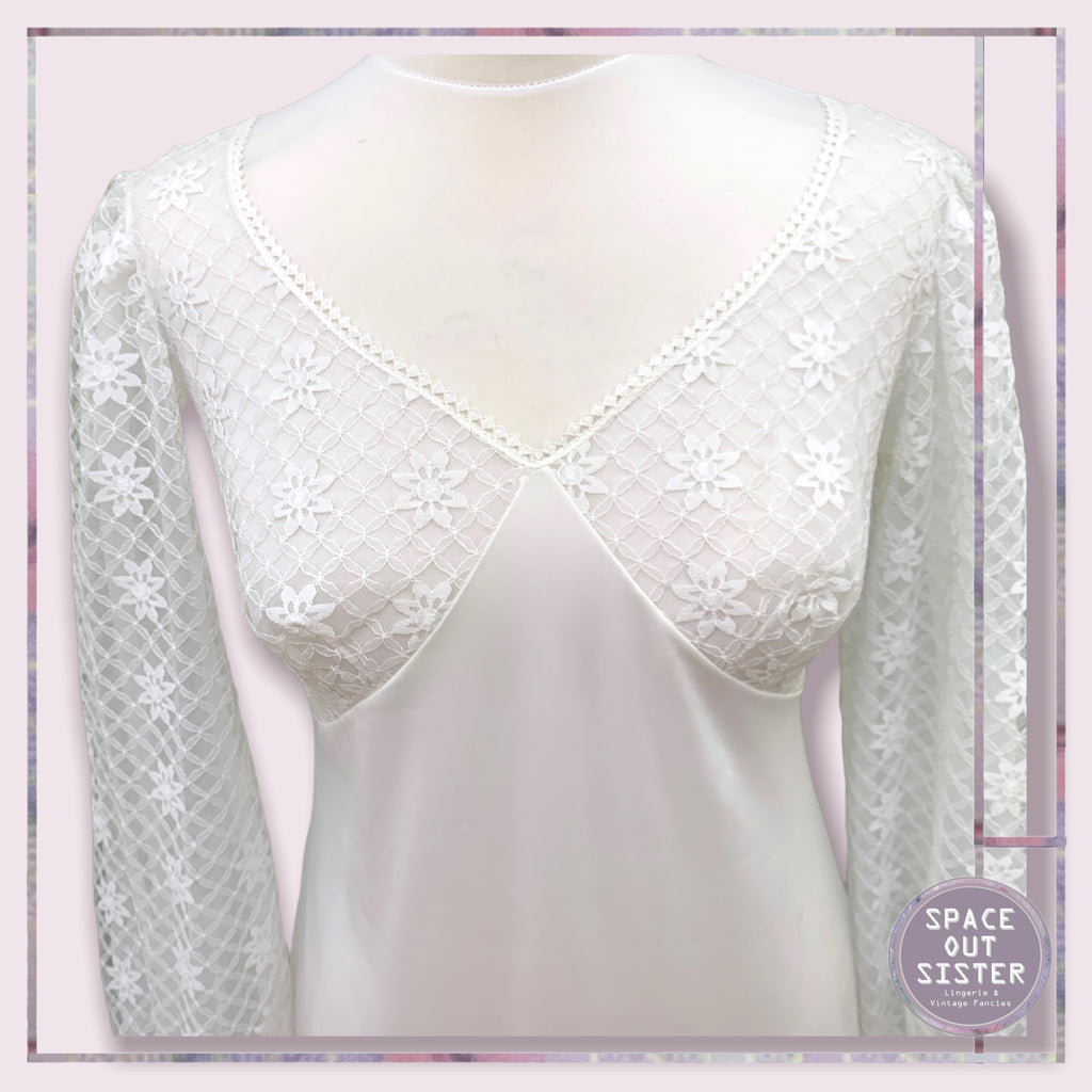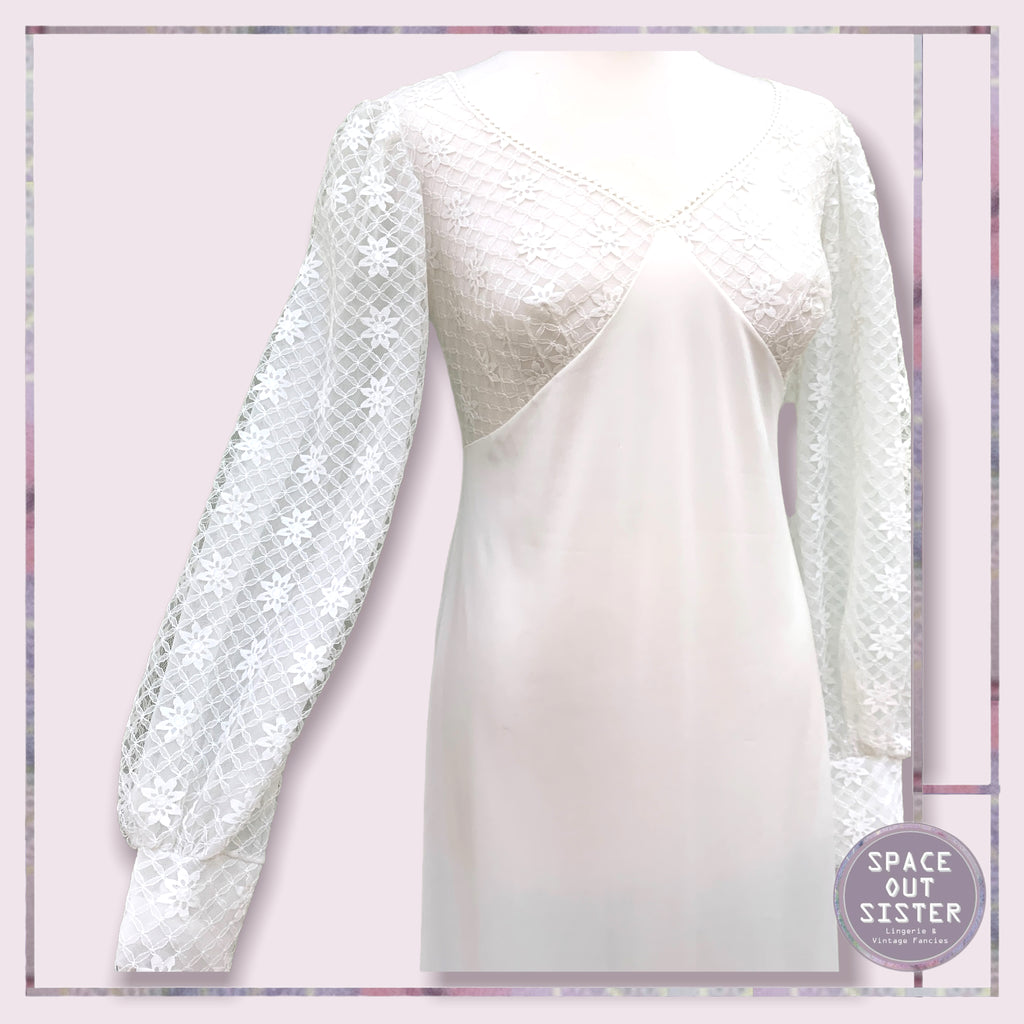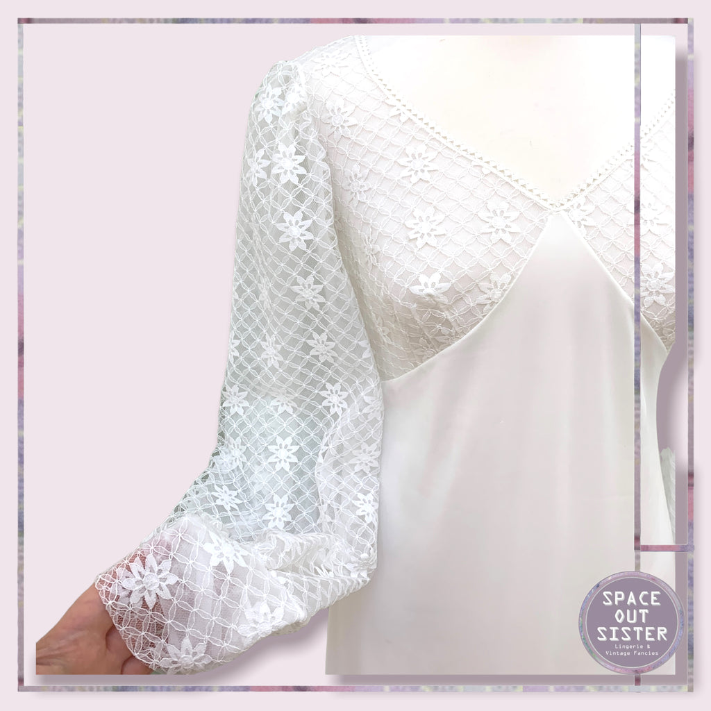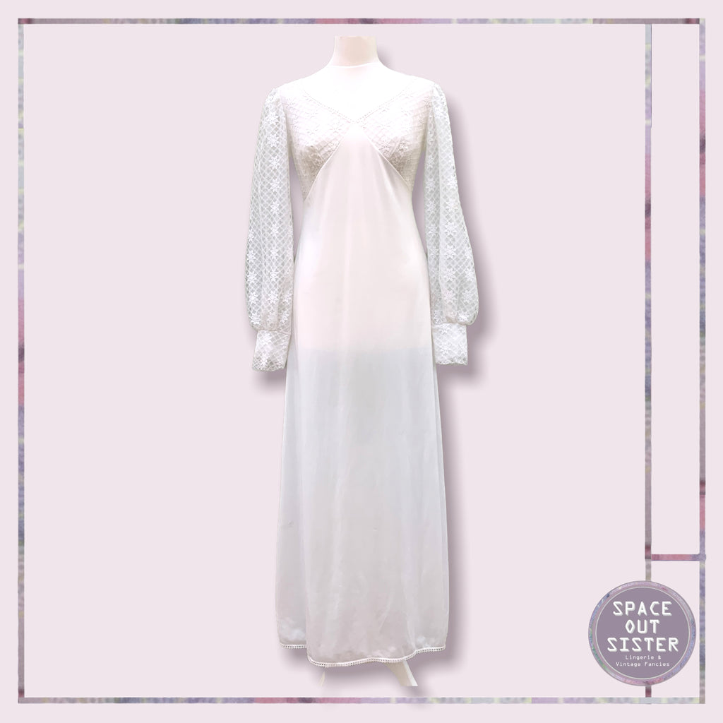 This wonderful French vintage white full length nightdress has a v neckline with a lace sleeve and defined bust area. Excellently presented piece.