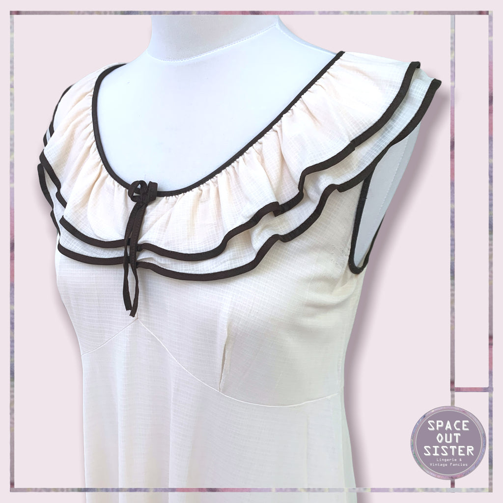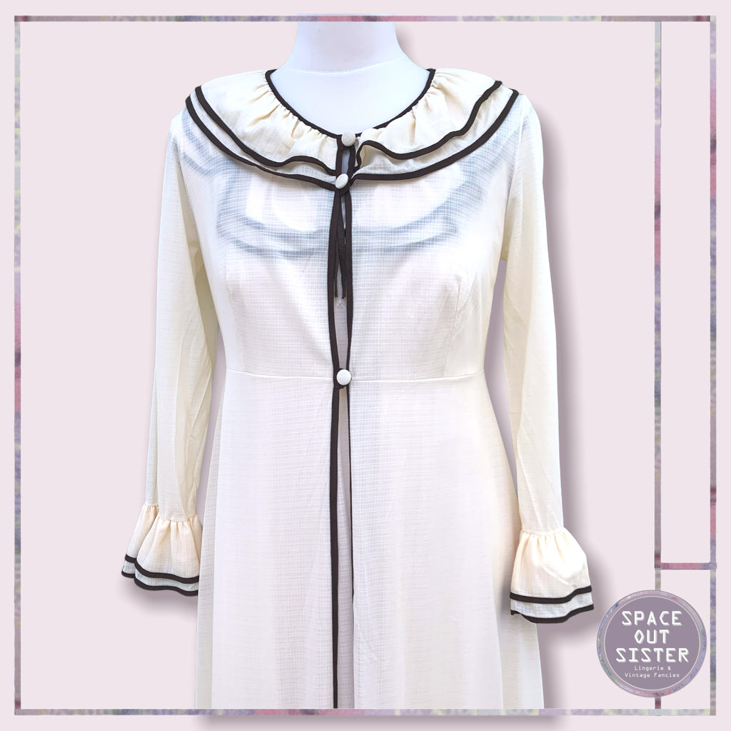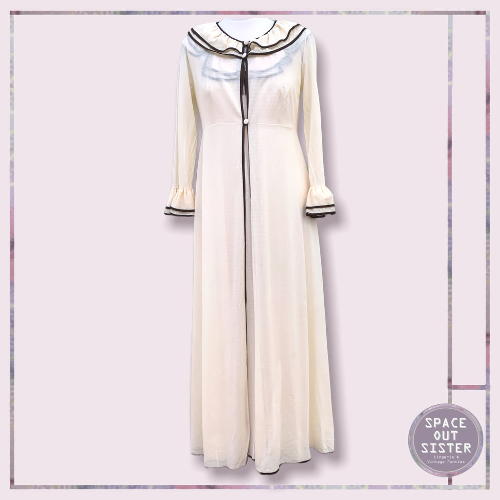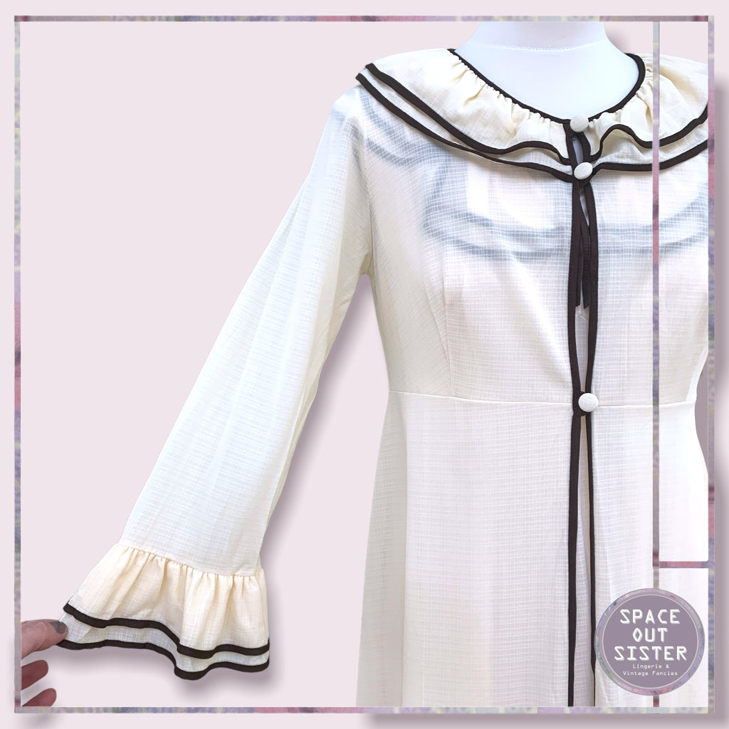 This circa 1970s two piece set is in a taupe colour with brown piping detailing. The two piece comprises of a full length sleeveless nightdress with a round ruffled neckline and a match robe with ruffles on each centre panel. The matching belt defines the silhouette with full length ruffled sleeves and cuffs. A stand out set.