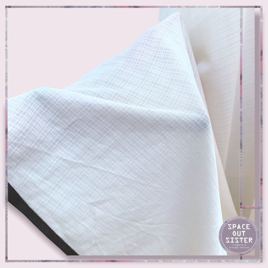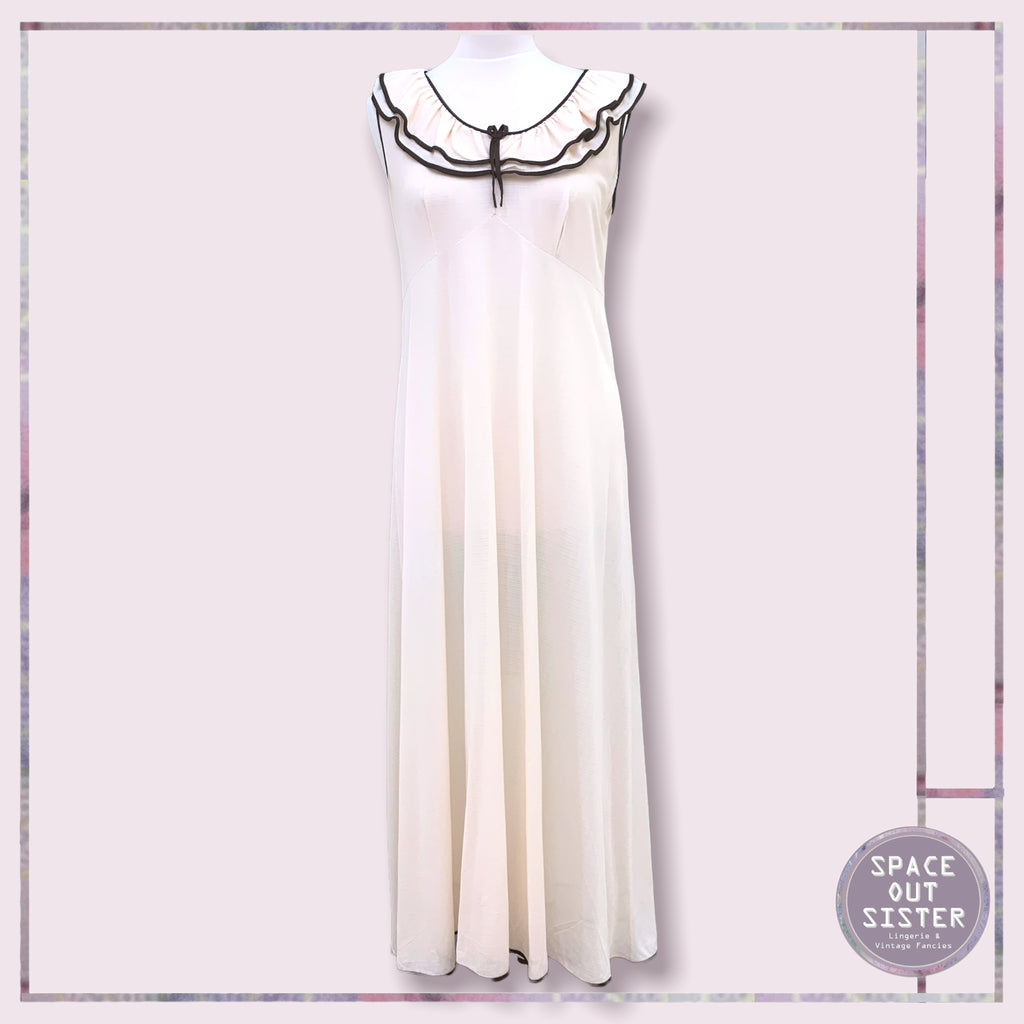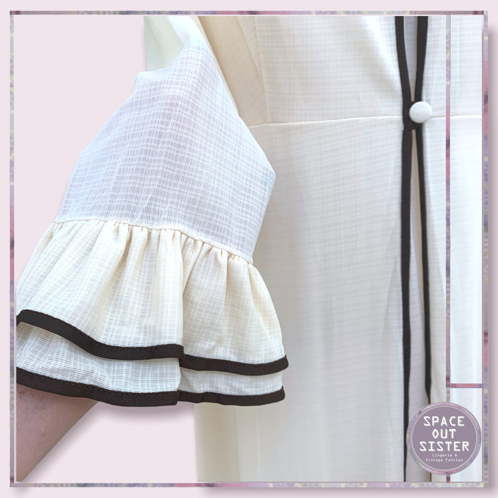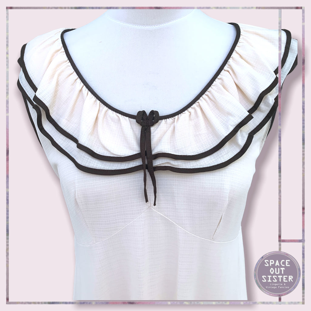This circa 1970s two piece set is in a taupe colour with brown piping detailing. The two piece comprises of a full length sleeveless nightdress with a round ruffled neckline and a match robe with ruffles on each centre panel. The matching belt defines the silhouette with full length ruffled sleeves and cuffs. A stand out set.