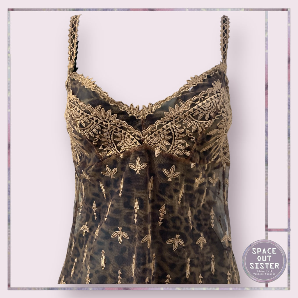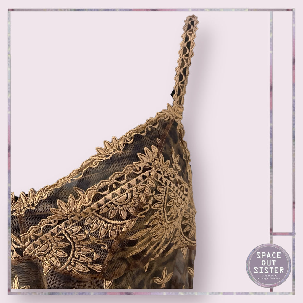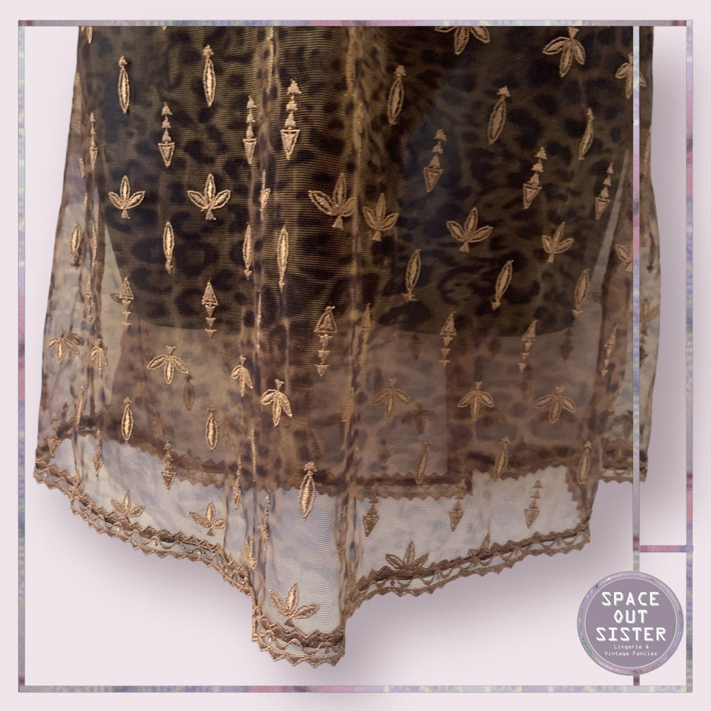 The Vintage Chantelle Sheer Nightdress is a must-have for any lingerie collection. This Short nightdress features a coco color with gold thread detailing, creating a stunning and elegant look. With a defined bust area and above the knee length, you'll feel both comfortable and glamorous. Elevate your sleepwear game with this beautiful piece.