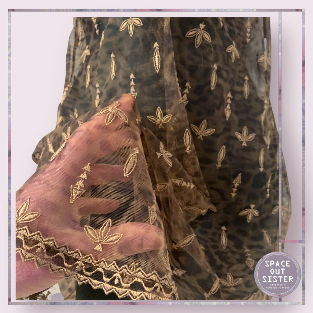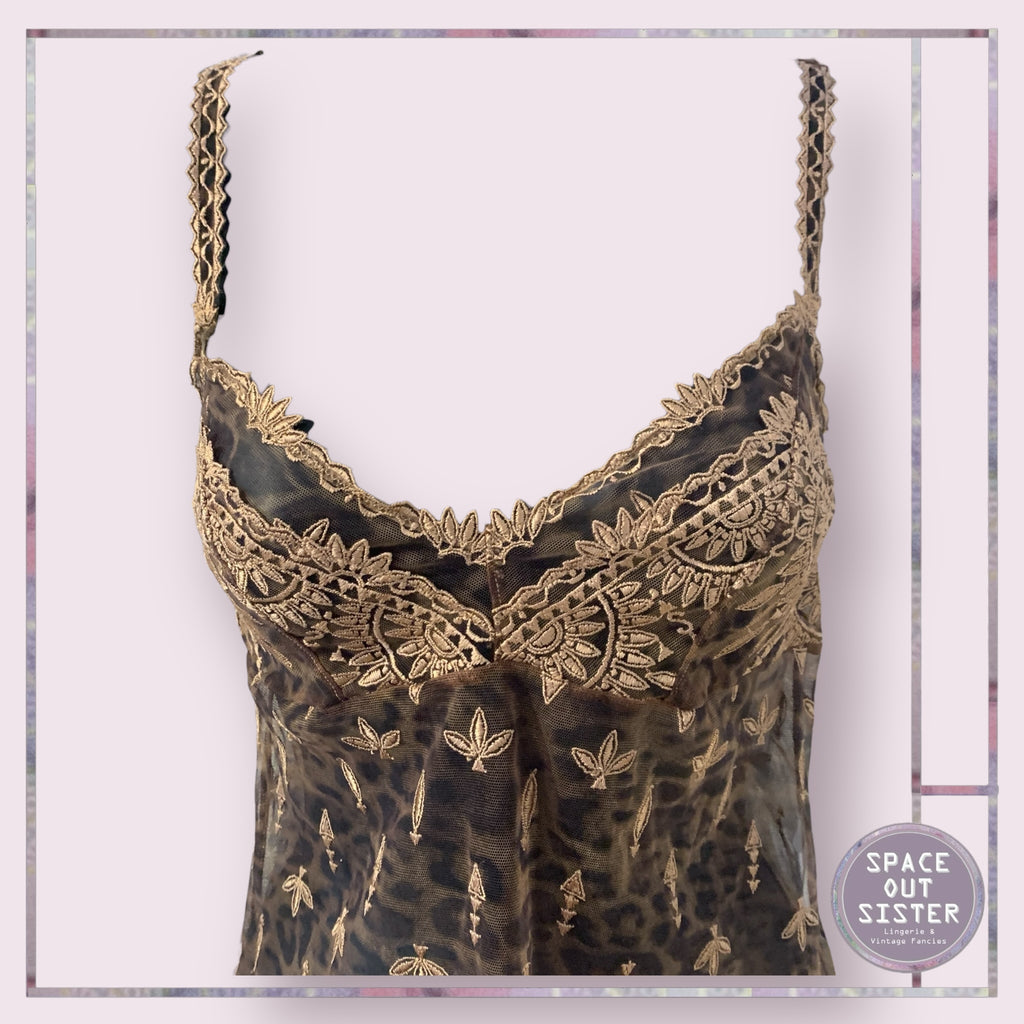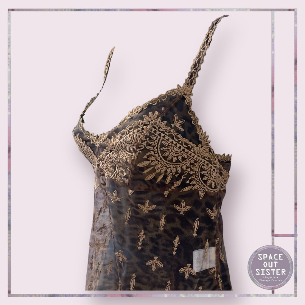 The Vintage Chantelle Sheer Nightdress is a must-have for any lingerie collection. This Short nightdress features a coco color with gold thread detailing, creating a stunning and elegant look. With a defined bust area and above the knee length, you'll feel both comfortable and glamorous. Elevate your sleepwear game with this beautiful piece.