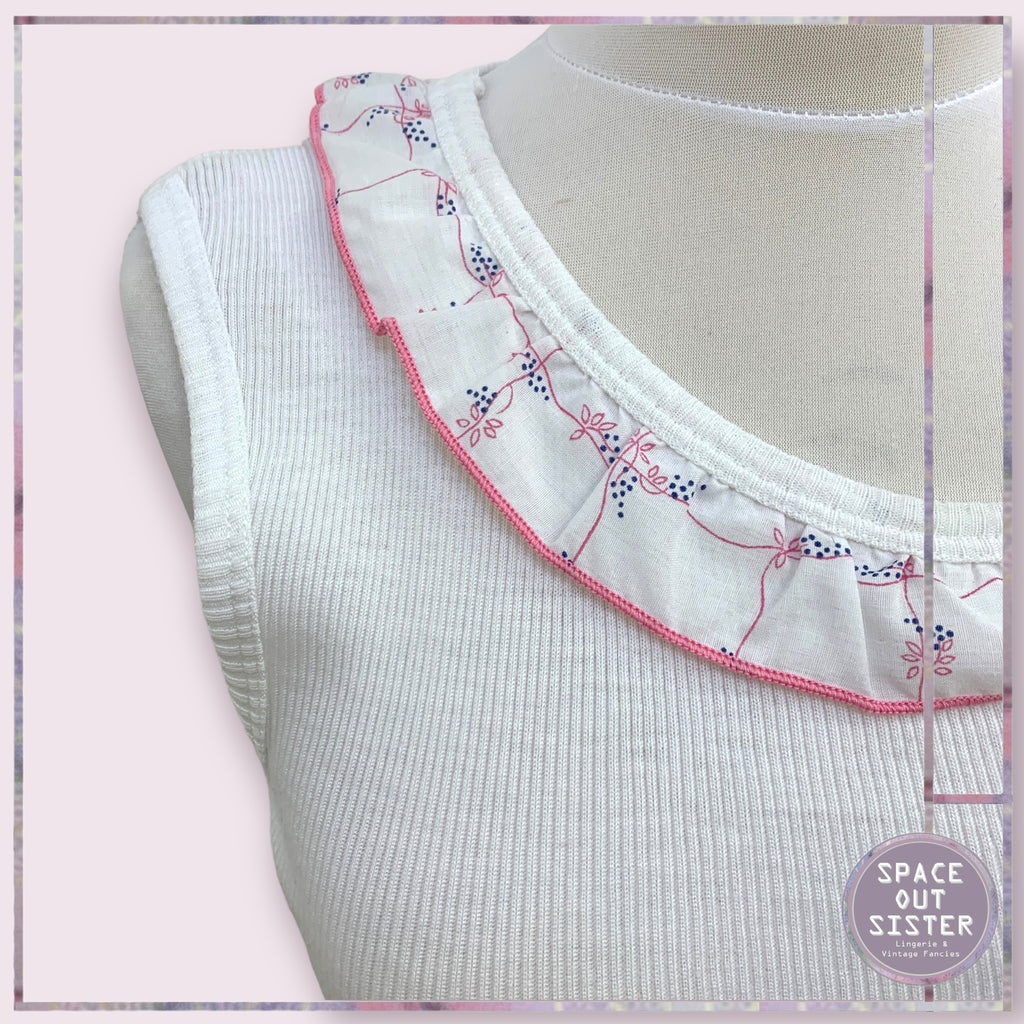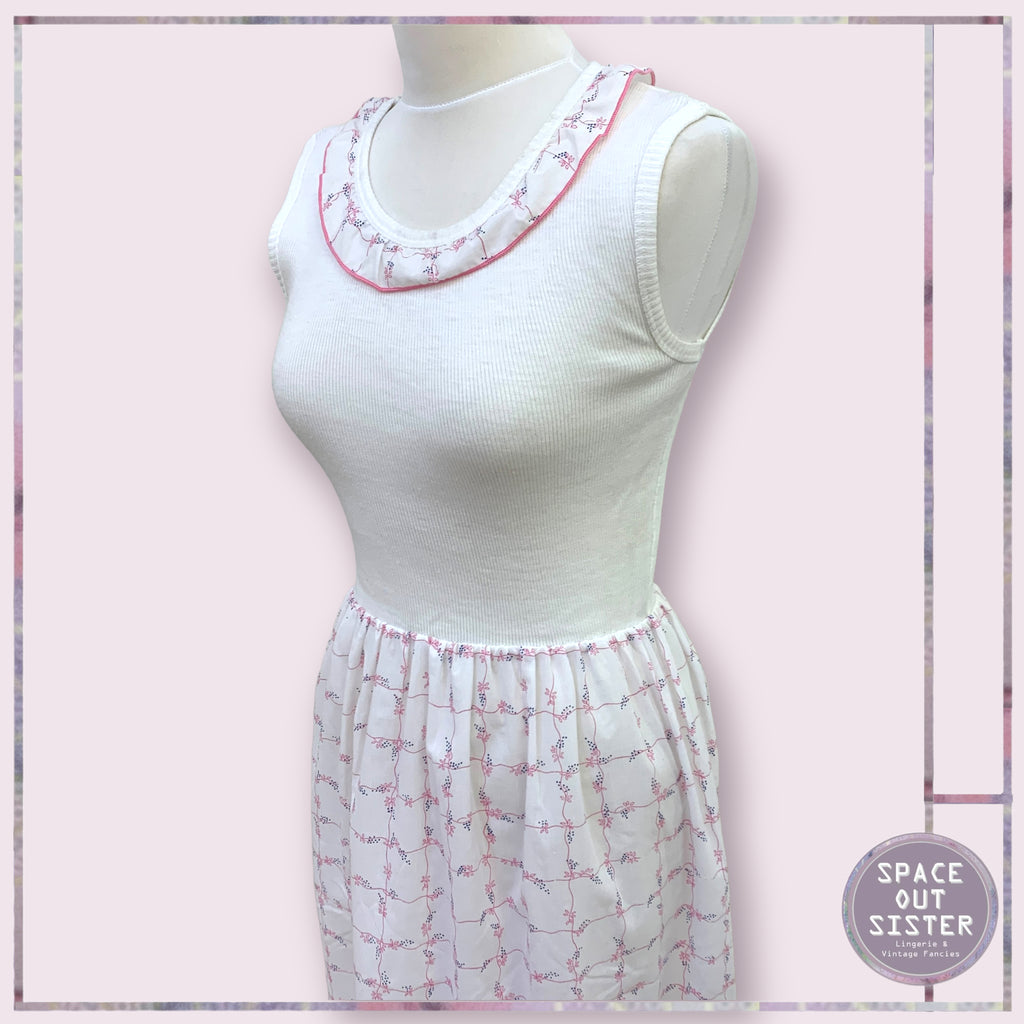 A fabulous rare vintage nightdress in white and pink with a ribbed knit top that leads to a full length patterned skirt. Sleeveless with detailing on the neckline. Very pretty and unusual find. Could be worn as outerwear too!