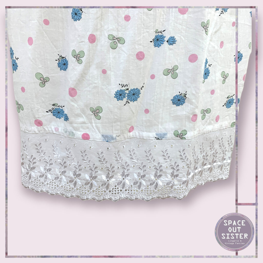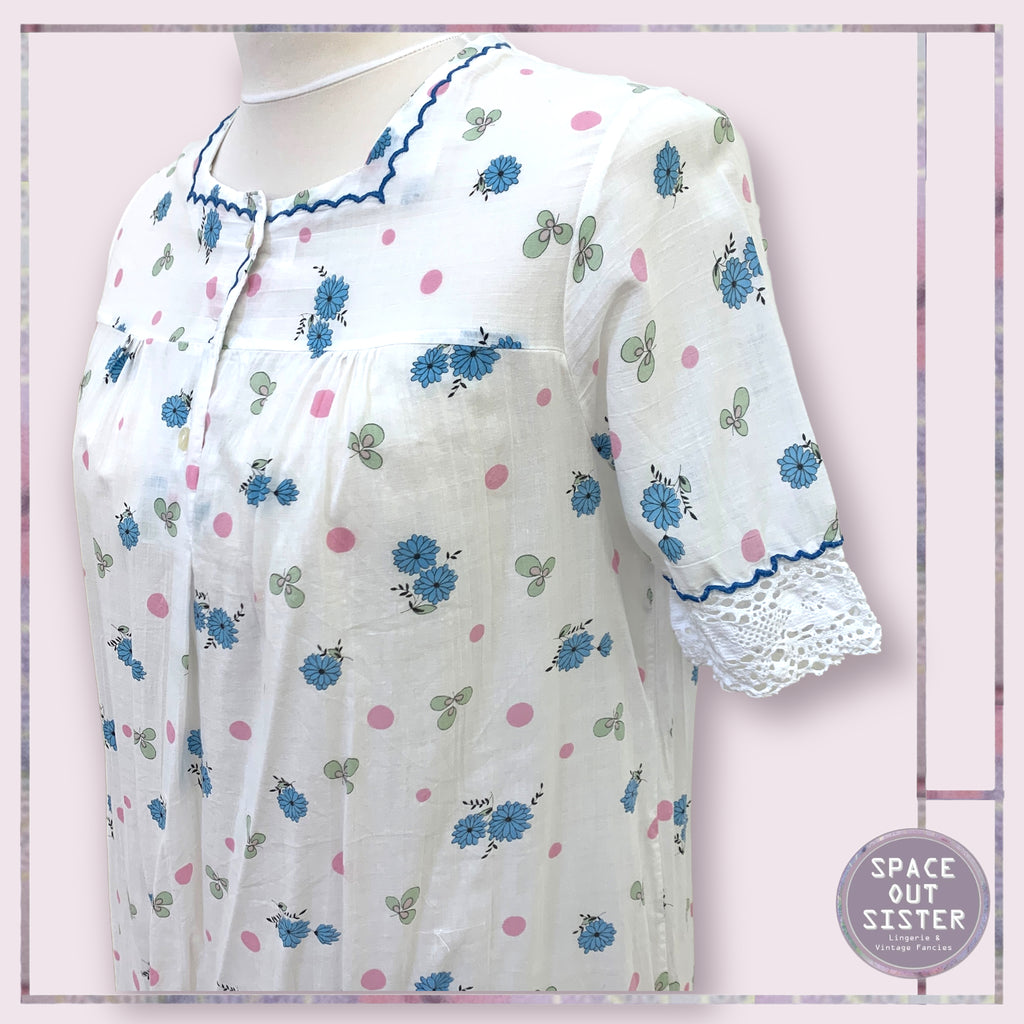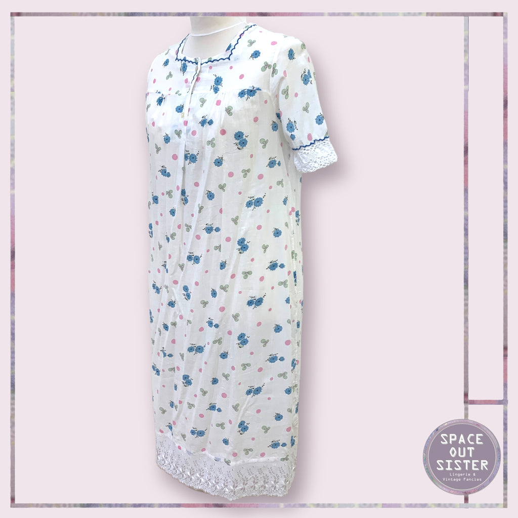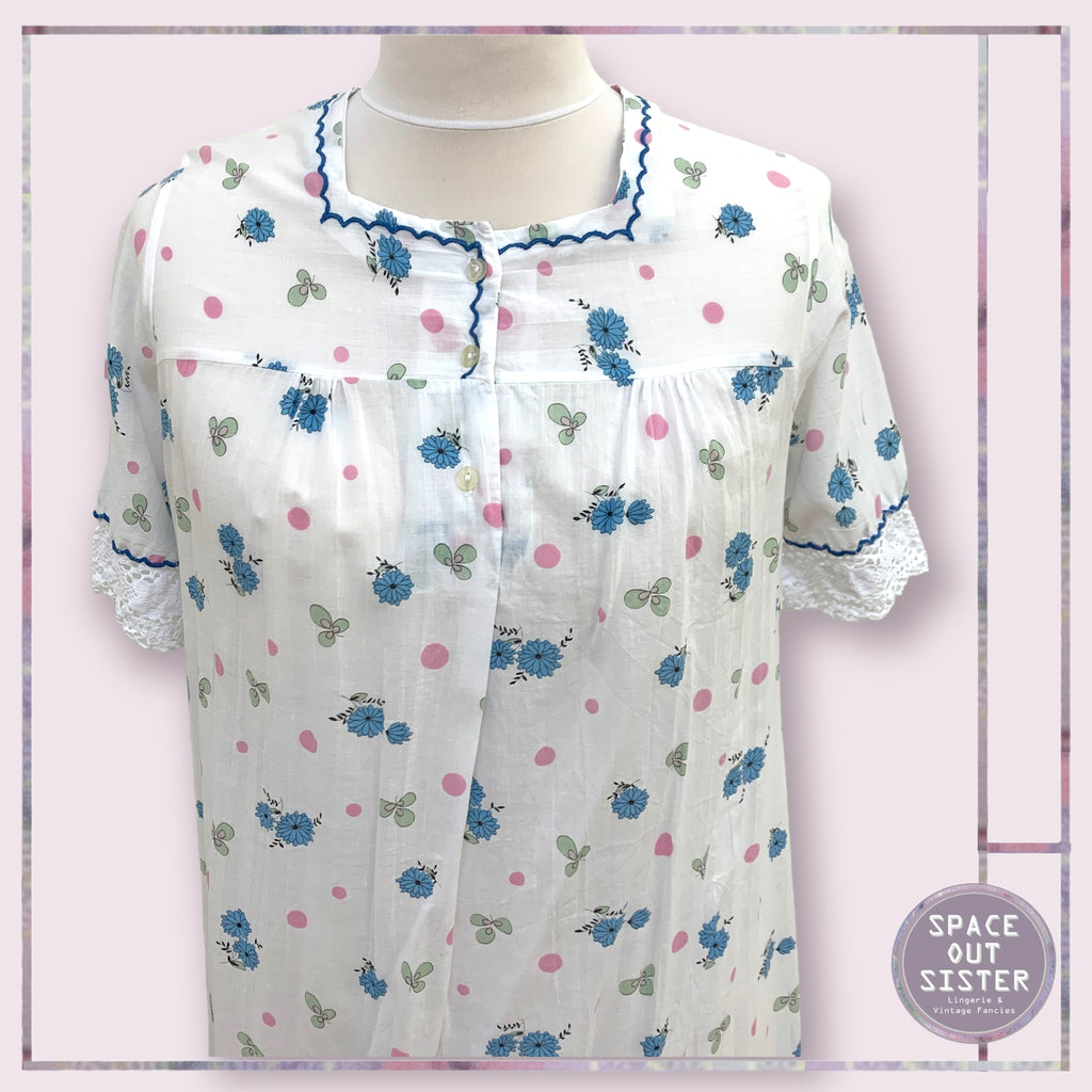 This cute vintage cotton lace trim nightdress has a beautiful beautiful blue floral design on a white background is calf length, with short sleeves trimmed with cotton lace. Excellently presented, this nightdress is sure to make you feel special.