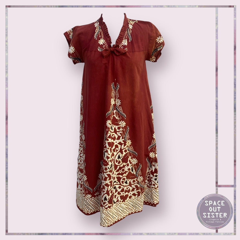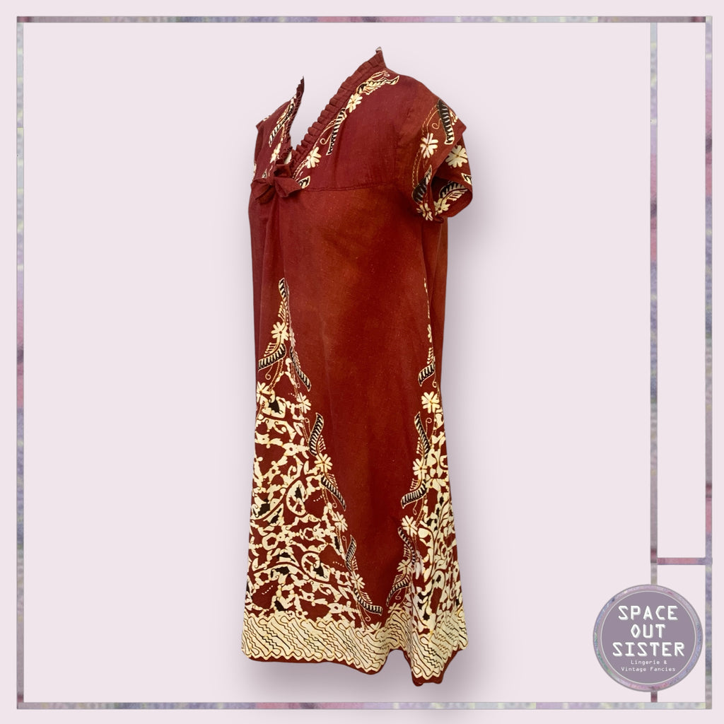 Vintage burgundy cotton nightdress with a beautiful print. Approximately knee length with a beautiful silhouette.