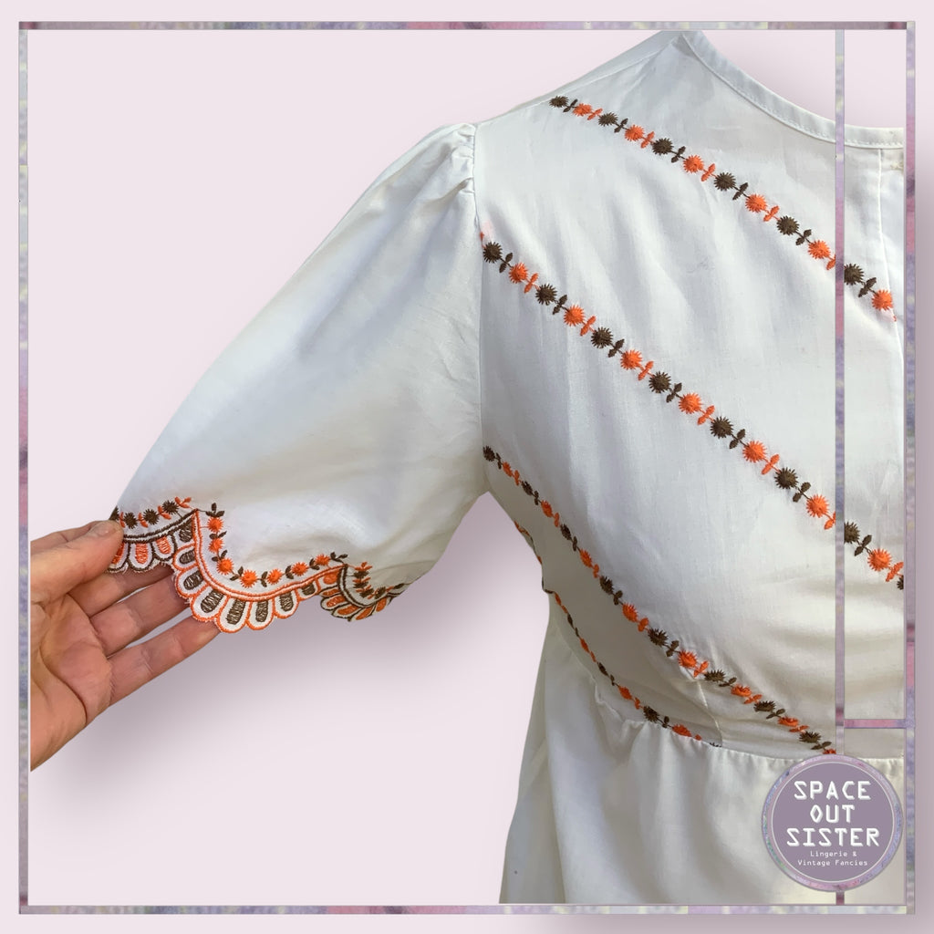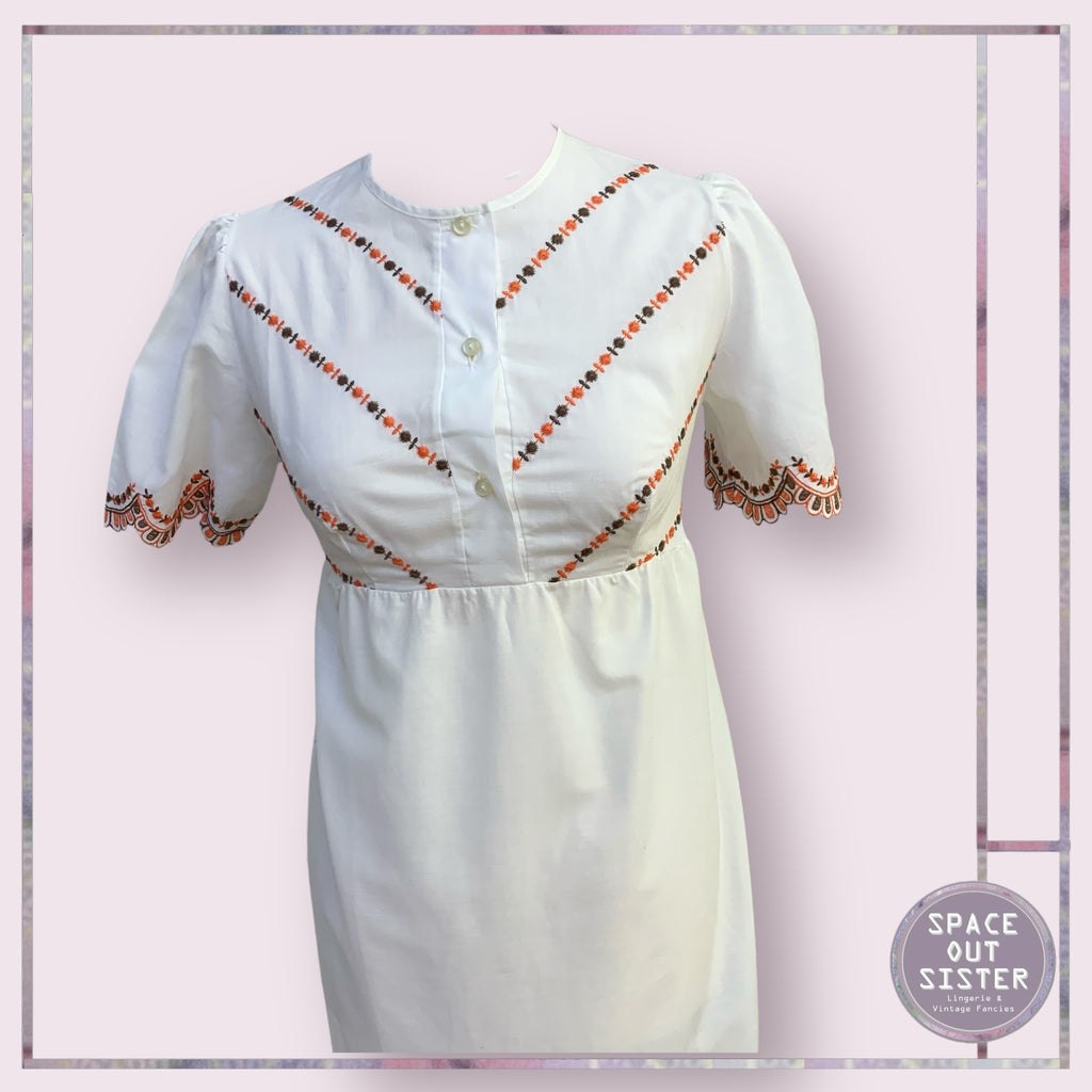 This outstanding vintage nightdress features a charming white design with rustic tones on the scallop edges. The short sleeves and knee length provide a comfortable and stylish fit. Perfect for a peaceful night's sleep or a relaxing evening at home.