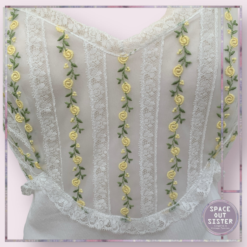 Expertly crafted by Van Realte, the Vintage Van Realte Lemon Nightdress boasts a stunning white design with lemon trim, accentuating the defined bust area. Its short length provides added comfort, making it the perfect addition to your bedtime wardrobe.
