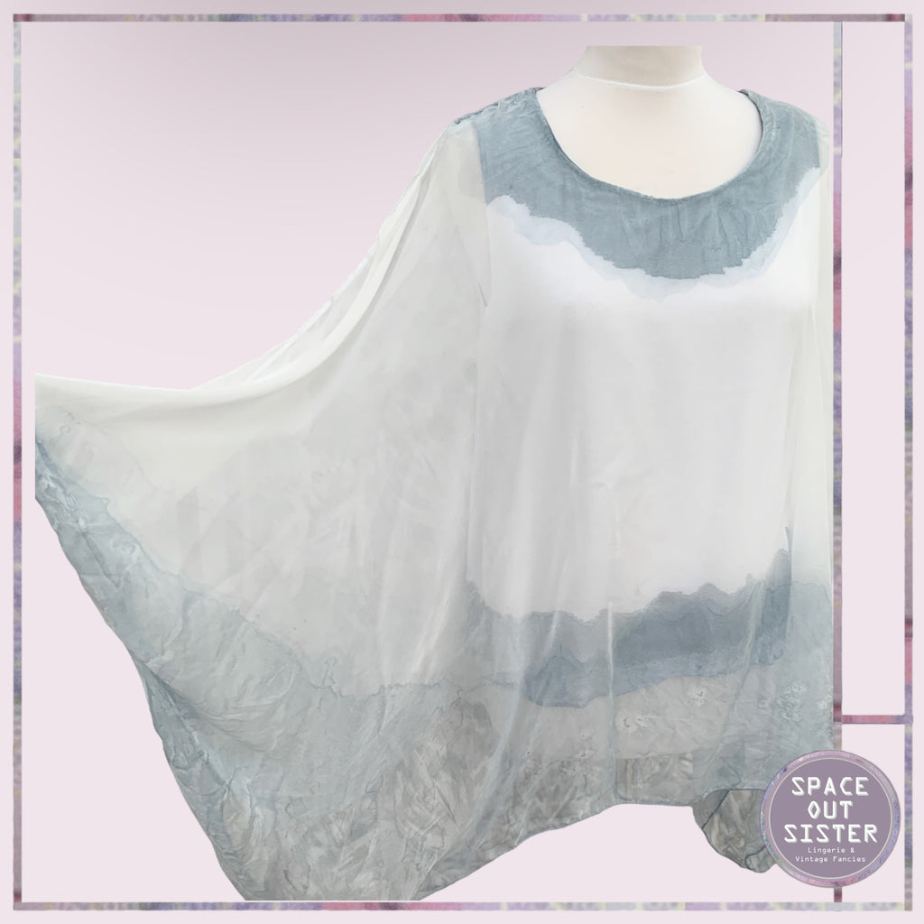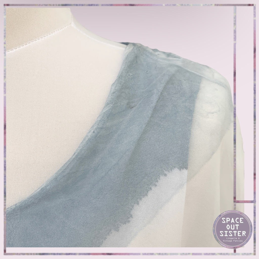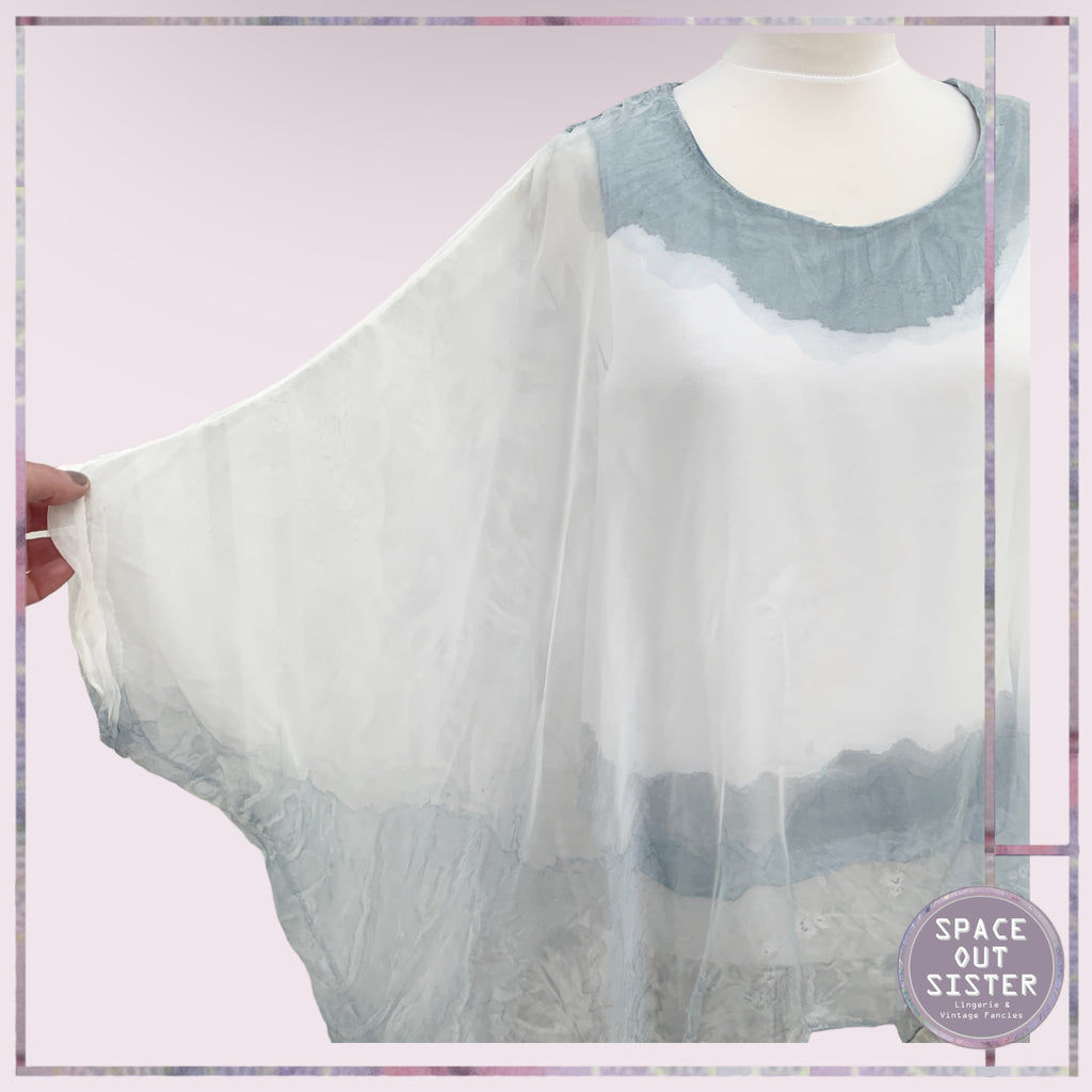 This Pre-Loved Italian Float Top is a versatile and stylish piece, perfect for any wardrobe. Crafted in Italy, the jersey top is a classic blue and white ensemble with a luxurious floaty chiffon layer. The size is adjustable for your desired fit and it is excellently presented.