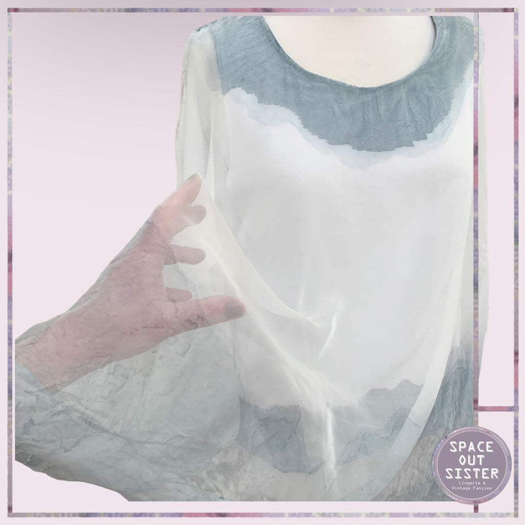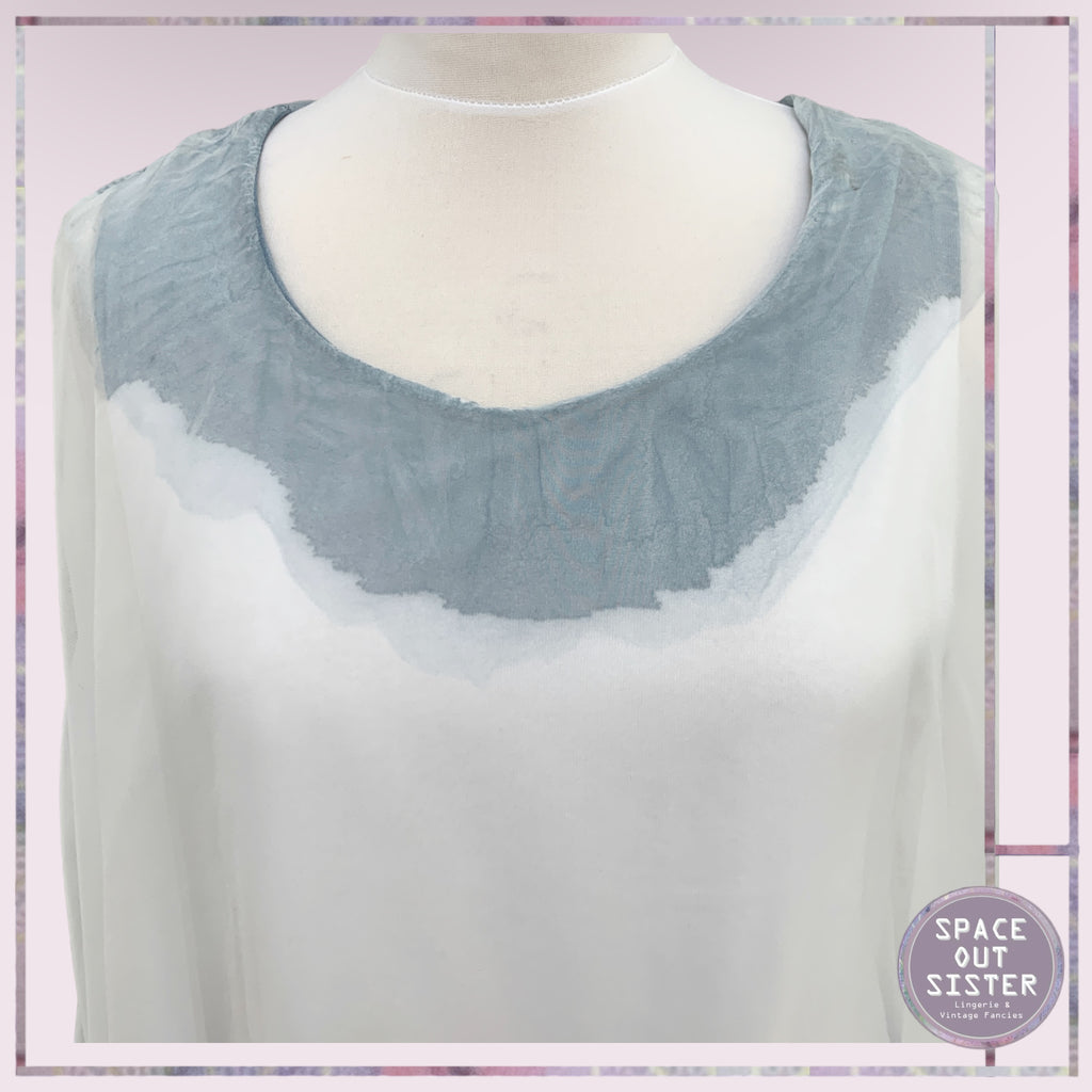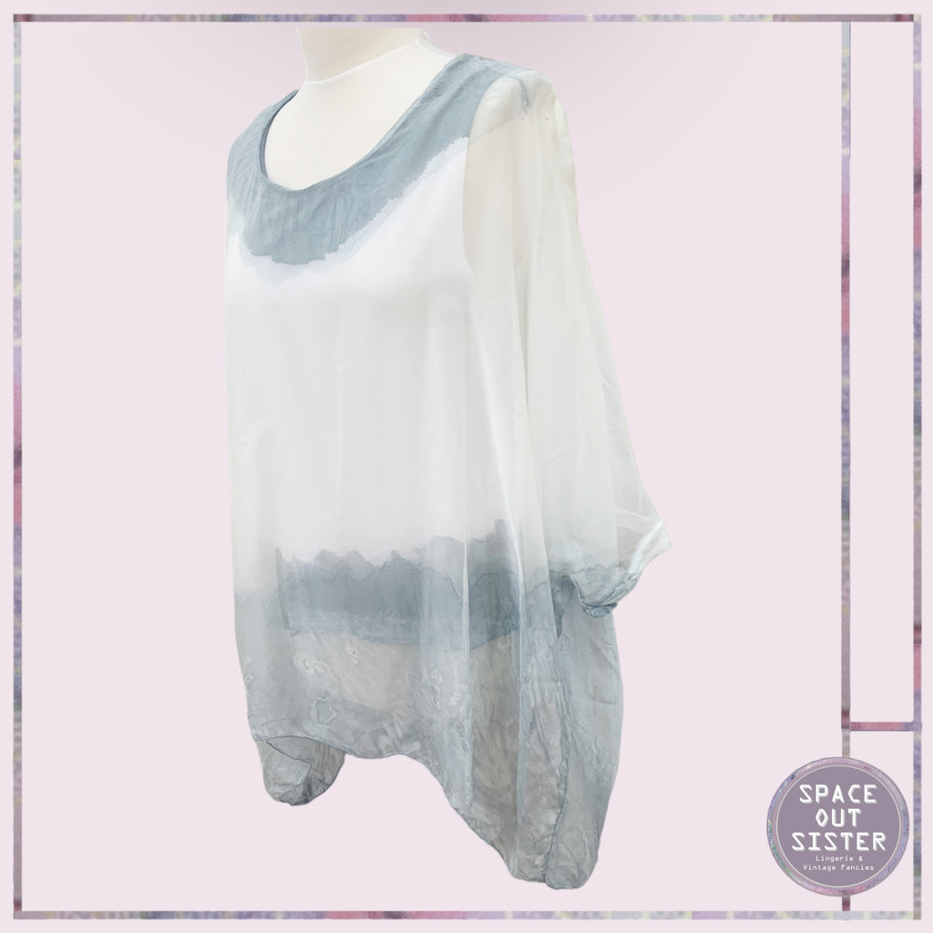 This Pre-Loved Italian Float Top is a versatile and stylish piece, perfect for any wardrobe. Crafted in Italy, the jersey top is a classic blue and white ensemble with a luxurious floaty chiffon layer. The size is adjustable for your desired fit and it is excellently presented.