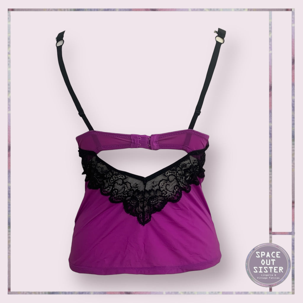 This purple camisole features moulded cups and underwired design for better support and shaping. The adjustable straps allow for a perfect fit, while the black accent detailing adds a touch of elegance. Feel confident and comfortable in this stylish undergarment.