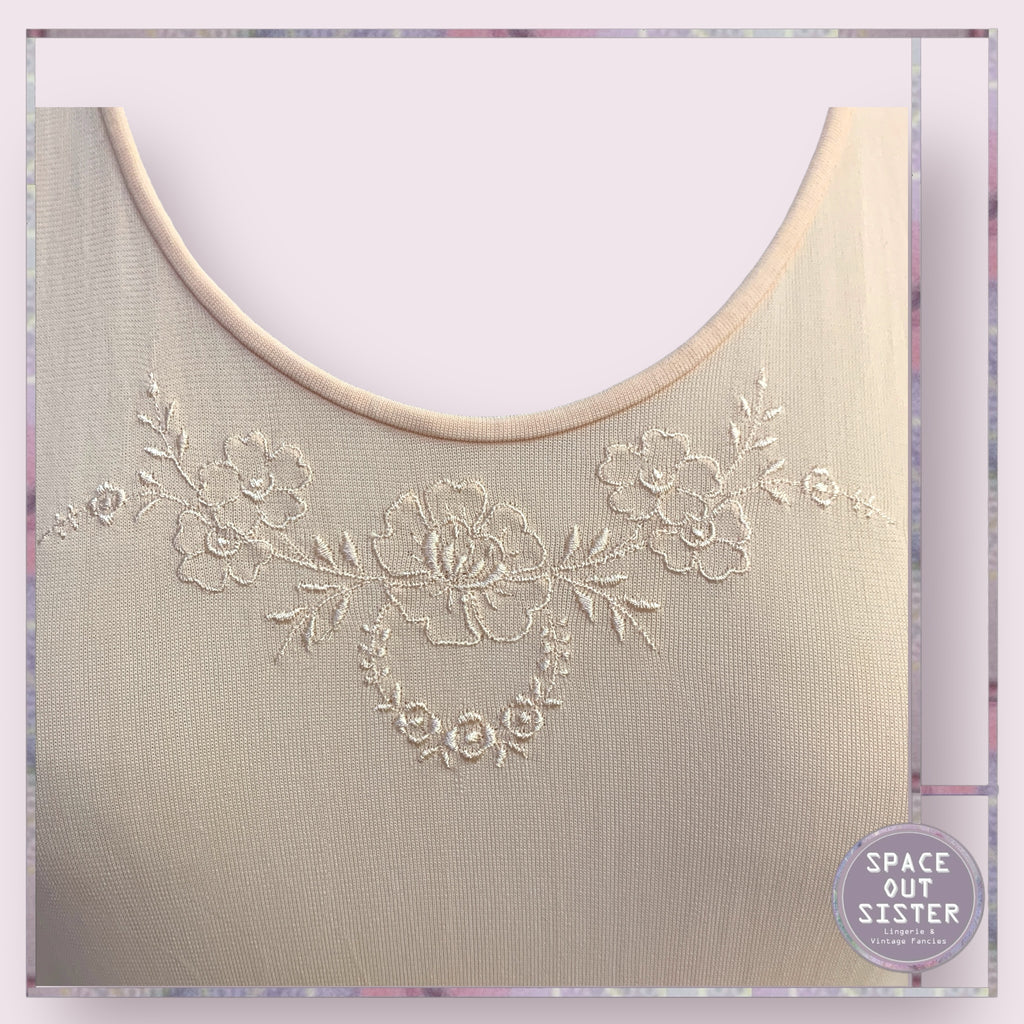 This fabulous vintage slip in apricot features a round neckline and intricate embroidered detailing. Made of soft tricot material, this slip will provide both comfort and style - perfect for any occasion. Enhance your wardrobe with this timeless piece.