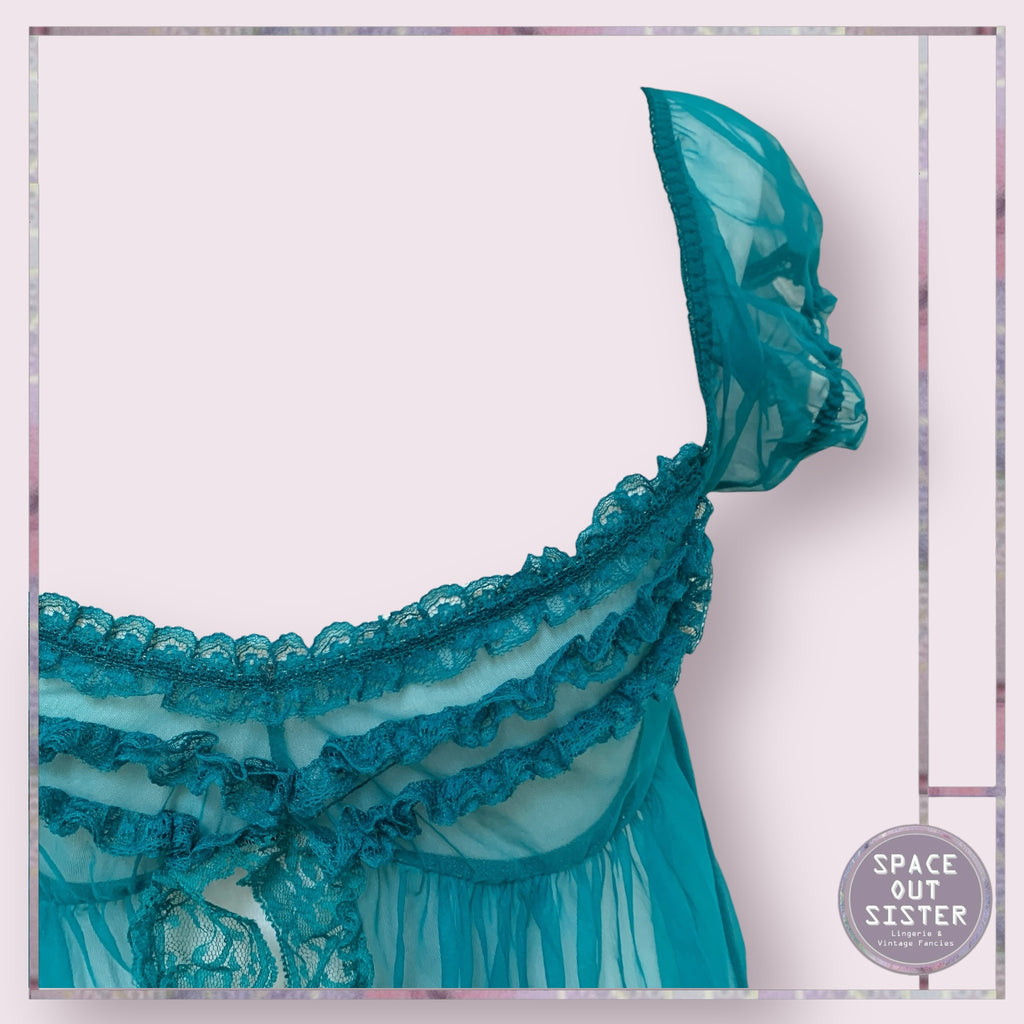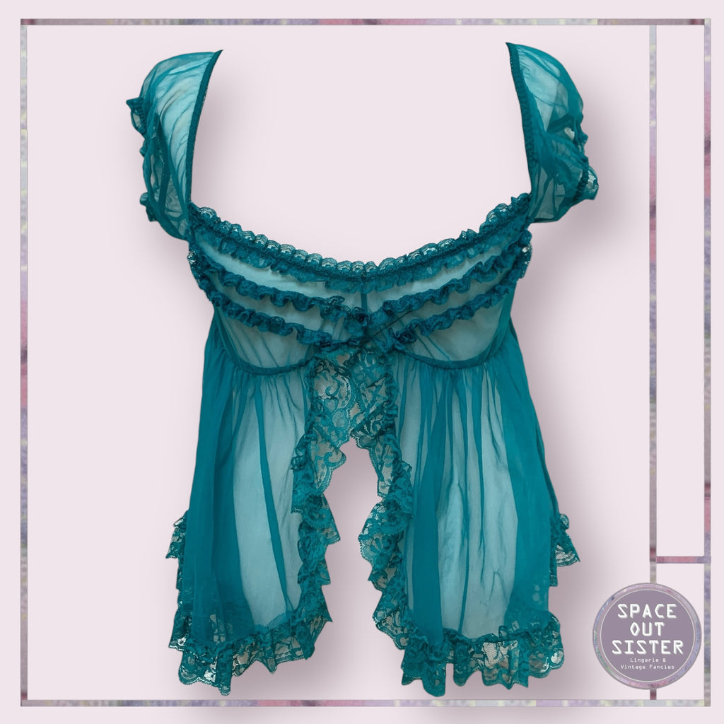 Elevate your lingerie game with our Vintage Dream Girl Lingerie Top. This teal top features a charming open ruffle front and a wide scoop neckline, adding a touch of vintage elegance to your wardrobe. Perfect for a romantic evening, this top will make you feel confident and alluring. As seen, a little frayed on the elastic but this doesn’t affect its wearability.