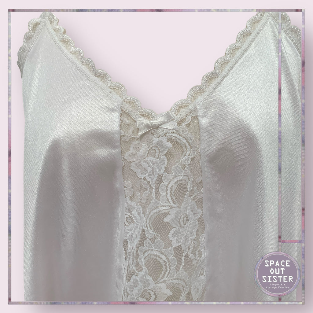 This vintage ivory camisole features a delicate lace insert on the front panel, creating a timeless and elegant look. With a loose fit, it offers both style and comfort. Perfect for adding a touch of vintage sophistication to any outfit.