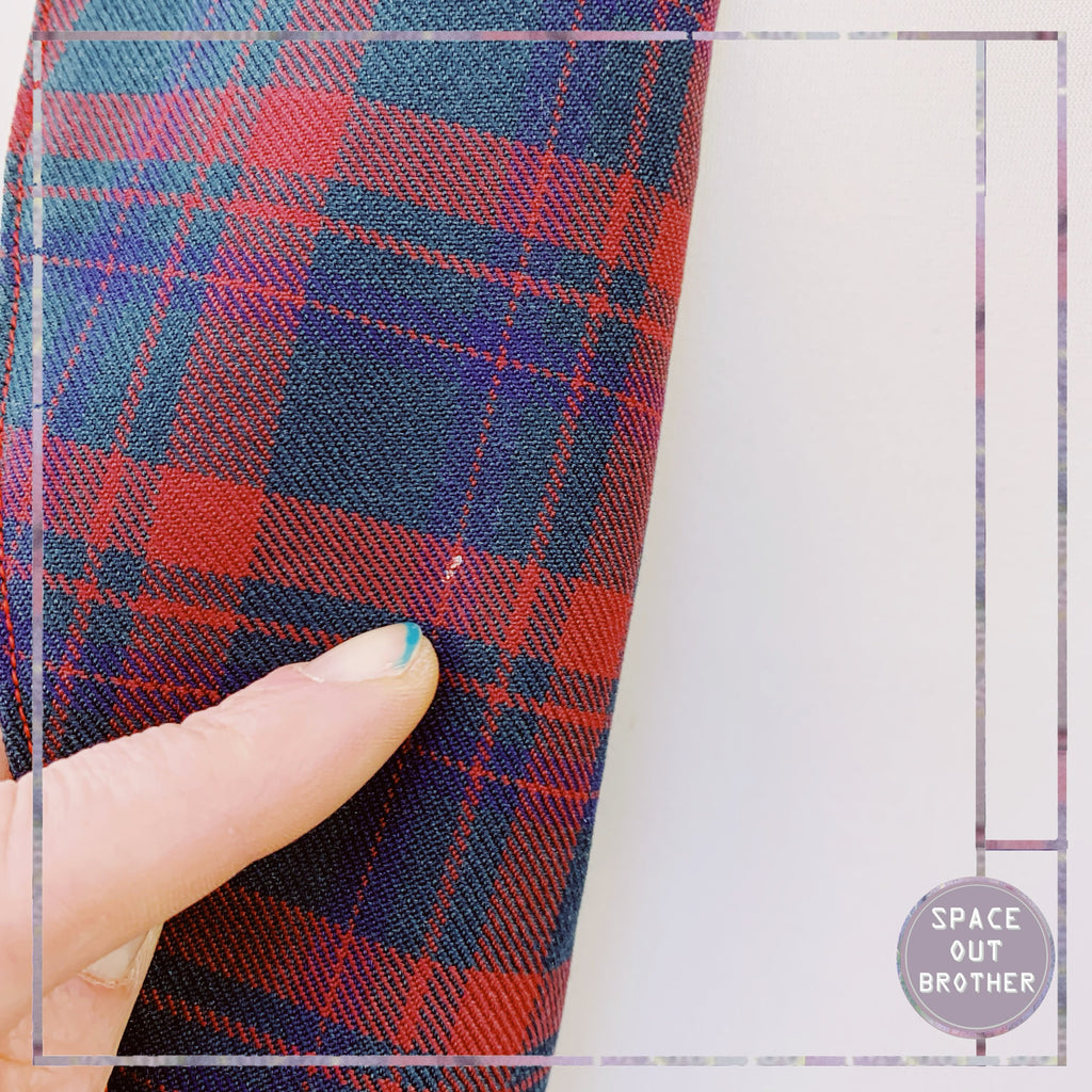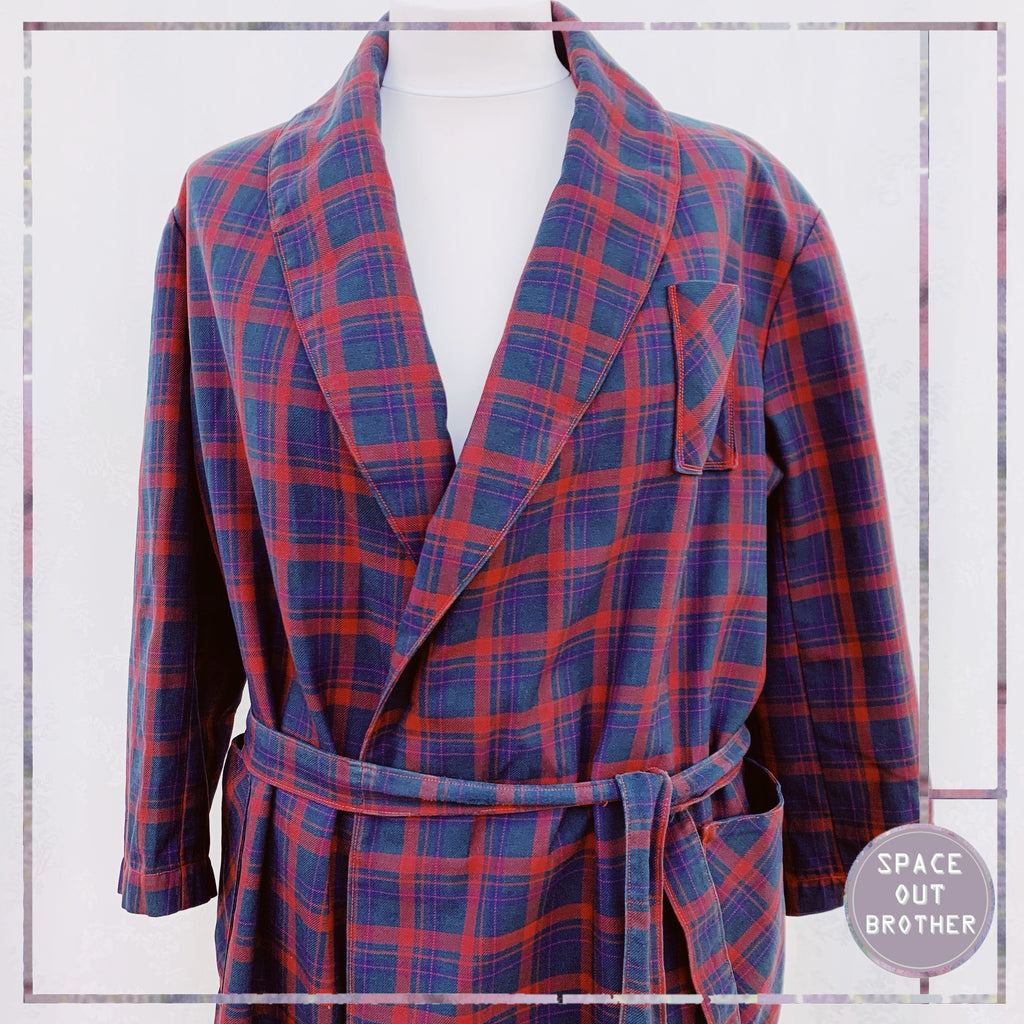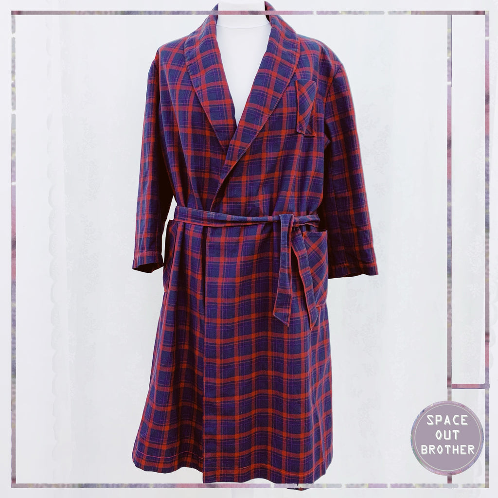 This vintage plaid dressing gown is in a navy and red. Belted with exterior pockets. As presented with a couple of flaws as the last photos show. Happy to help with any questions you may have.