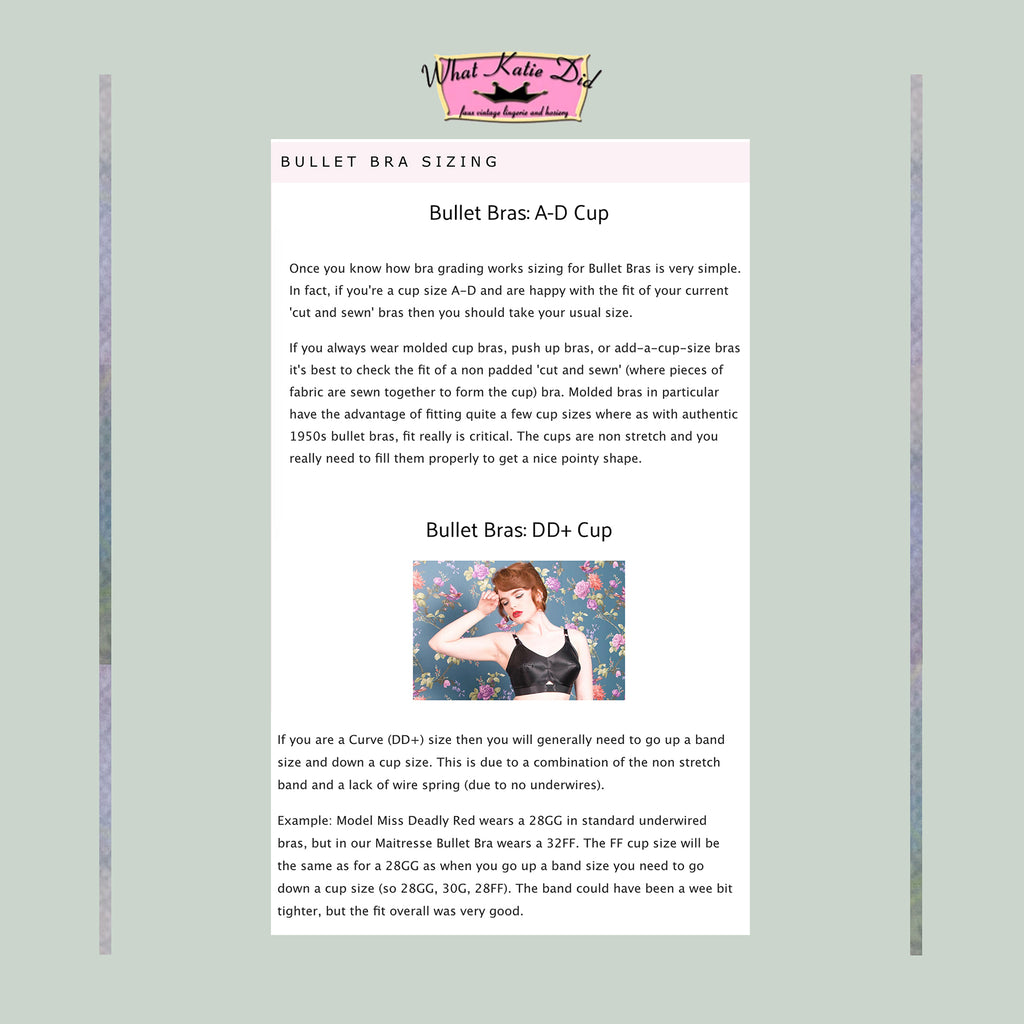 In the 1950s bras only went up to a D cup. What Katie Did have regraded the cups of our DD+ cup sizes to ensure a flattering fit right up to an F cup. Our fabulous deep Suspender Belt and Knickers now go up to a UK size 22.