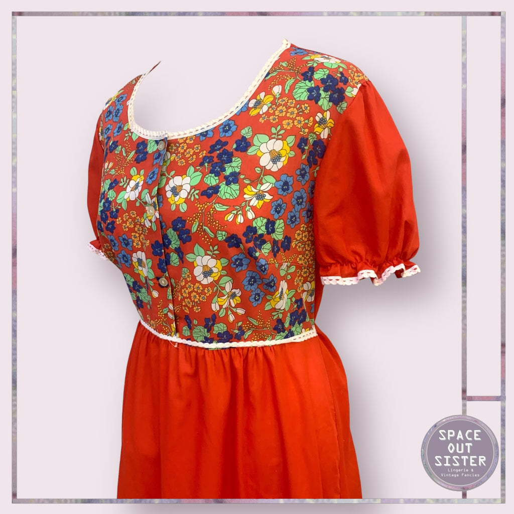 Experience timeless beauty with our Vintage Red Floral Nightdress. This full-length nightdress, circa 1970s, features a stunning red floral print, ruffle contrast hemline, and a tie-back for added elegance. Indulge in luxurious comfort with this absolutely gorgeous nightdress.
